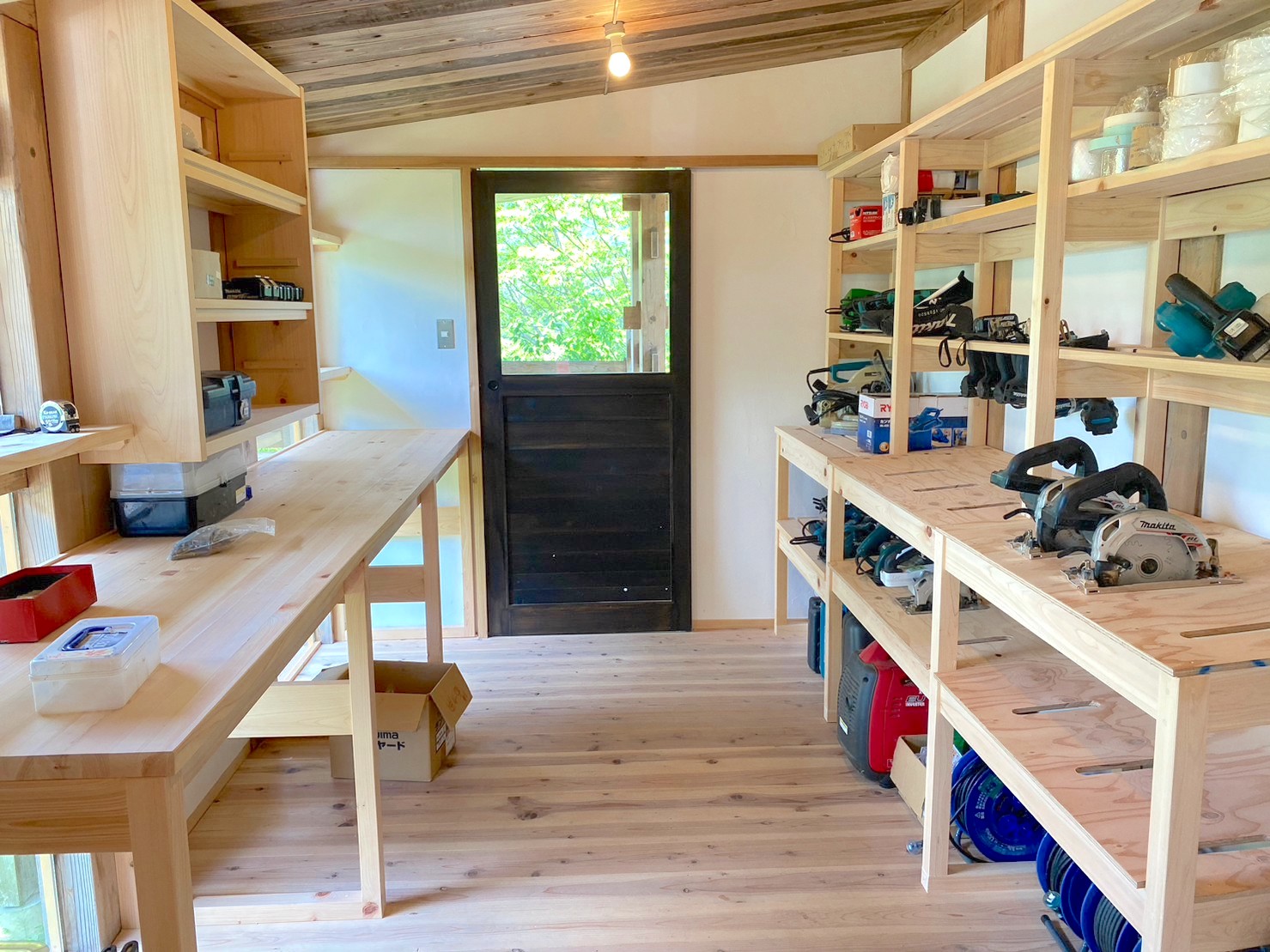 大きな作業机と作業に使う道具が収納できる棚が設置されています。