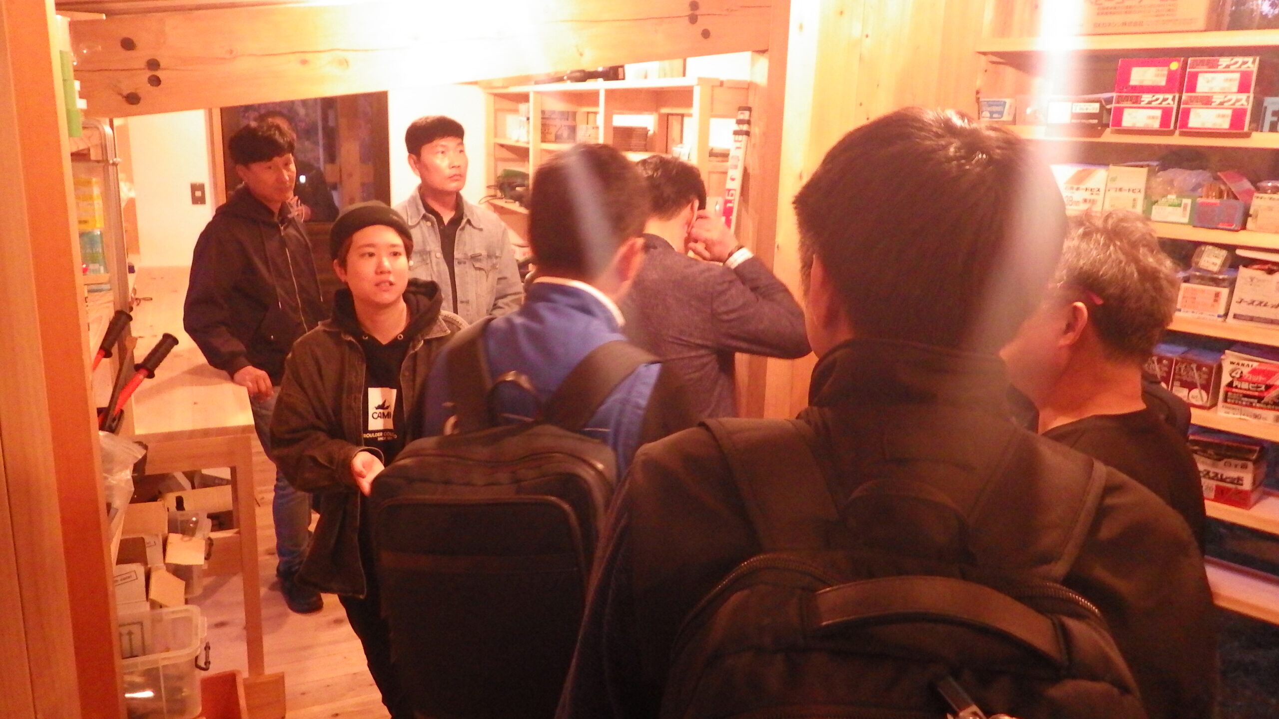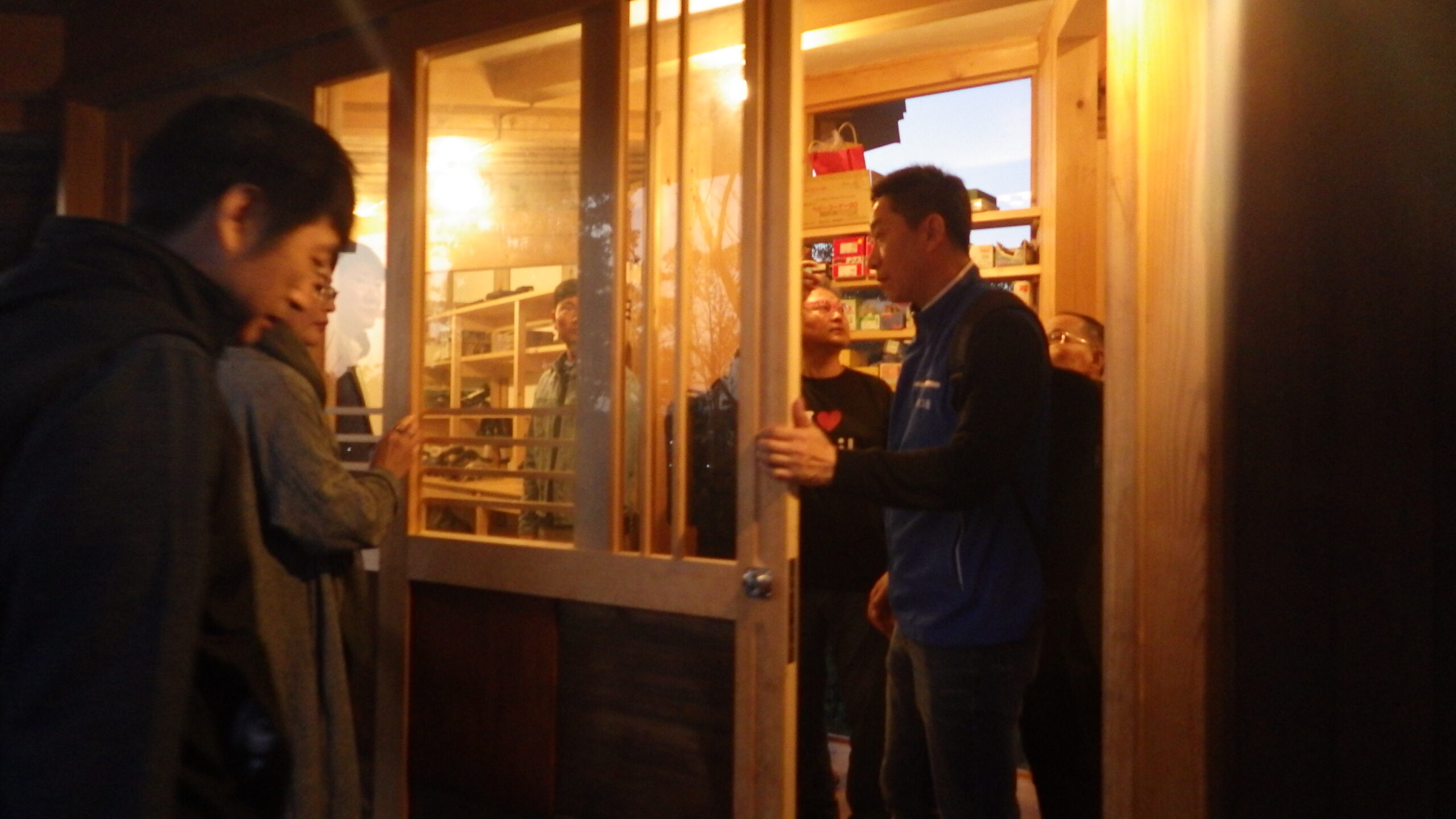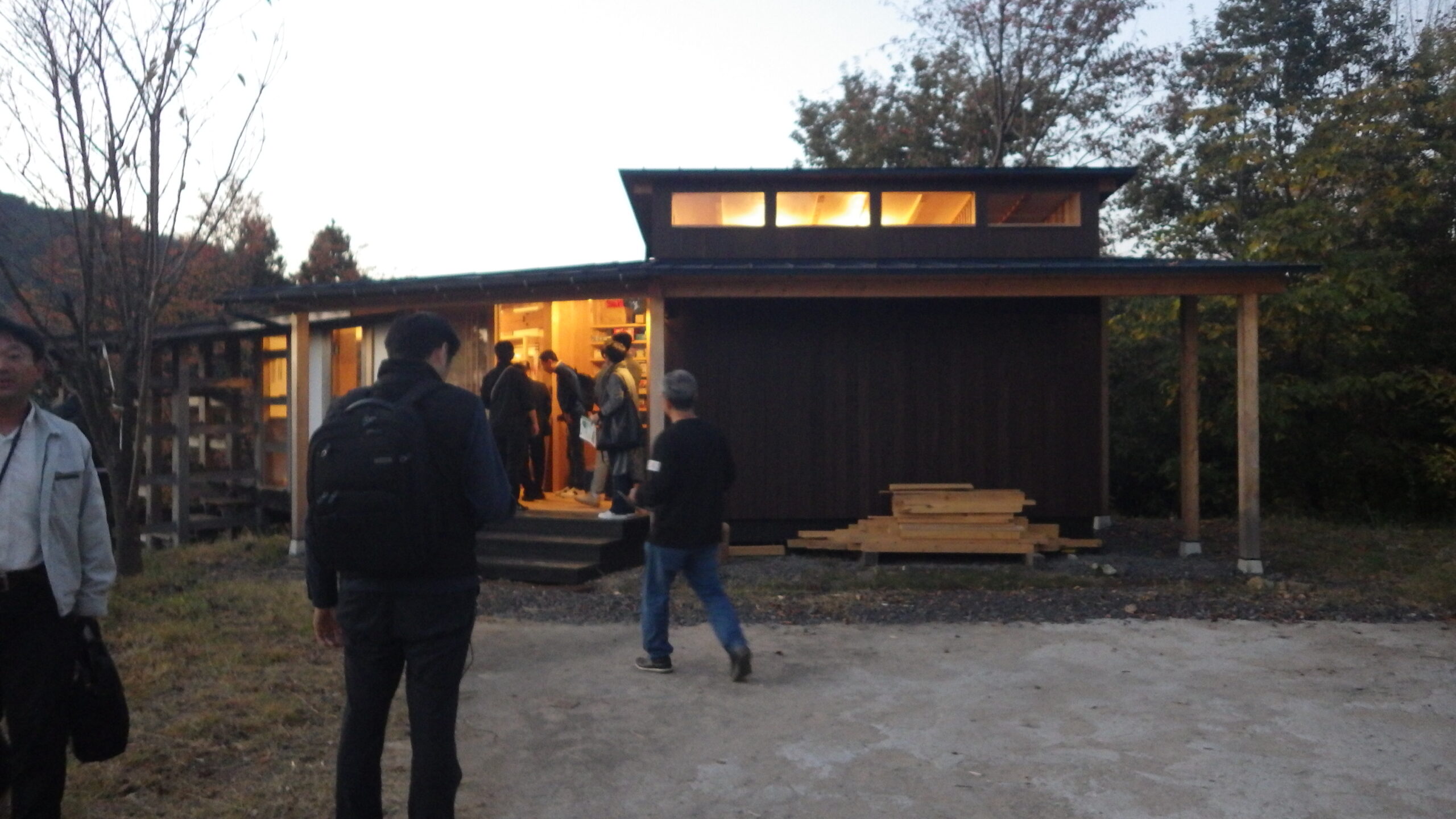 視察開始時刻が夕方の時間になってしましましたので、morinosおよび令和4年度自力建設プロジェクトの建物の2棟を視察していただきました。