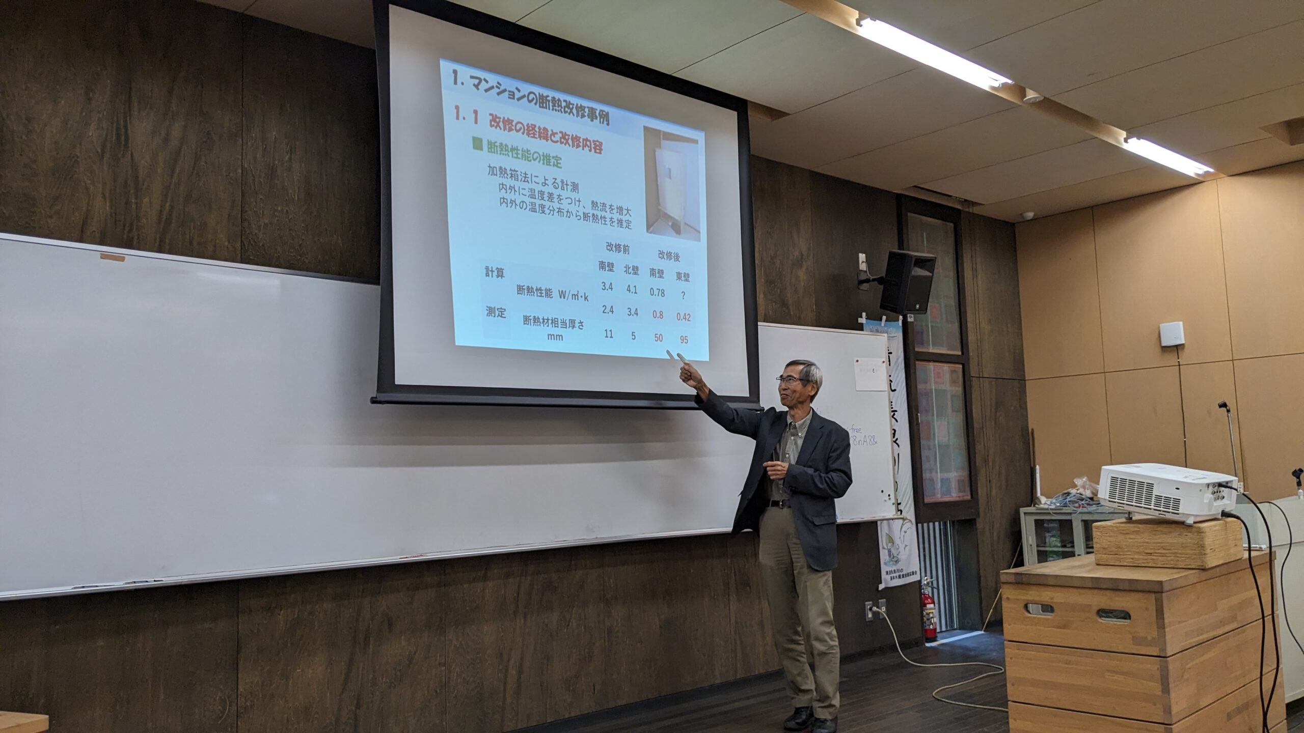 その中で、実際に熱性能を計測する加熱箱法による断熱性能推定などは非常に興味深いものでした。