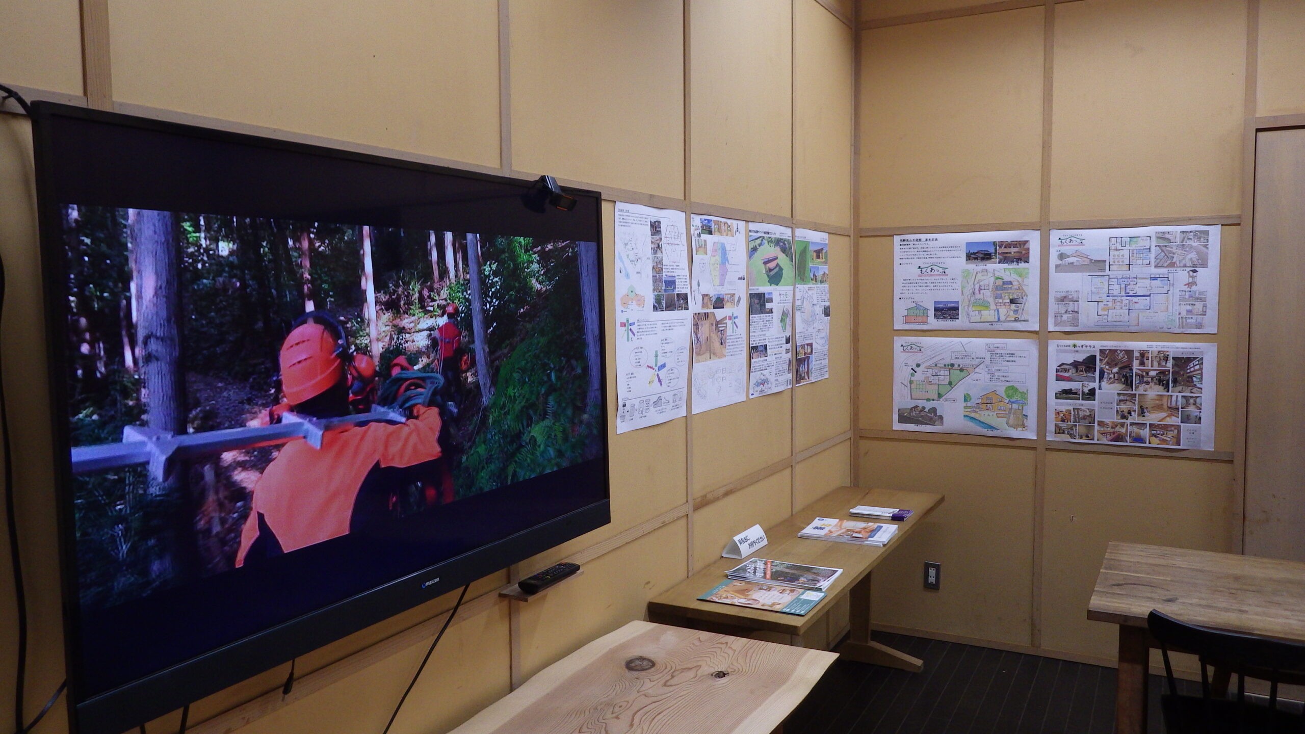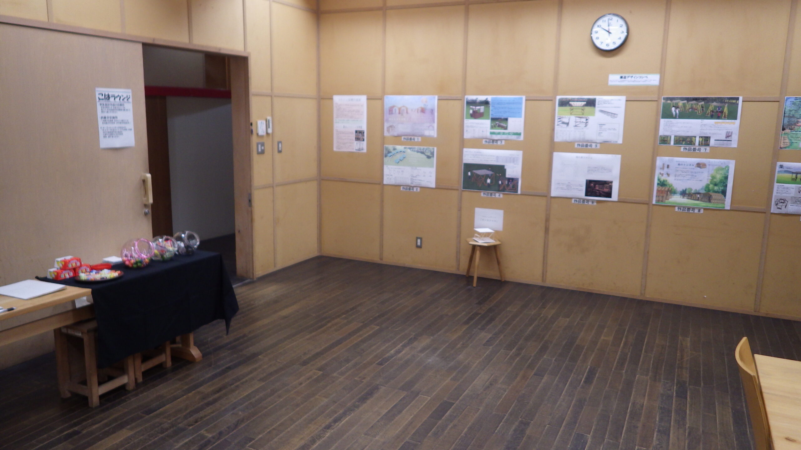 森林文化アカデミー翔楓祭で「こはラウンジ」を開催しました。今年は、アカデミーにおける教育活動や受託研究活動、地域連携活動、学生の自主的活動などをパネル展示および映像展示、さらに翔楓祭来場者による設計作品への投票会などを行いました。毎年恒例のお菓子引換所(こども限定)も行いました。