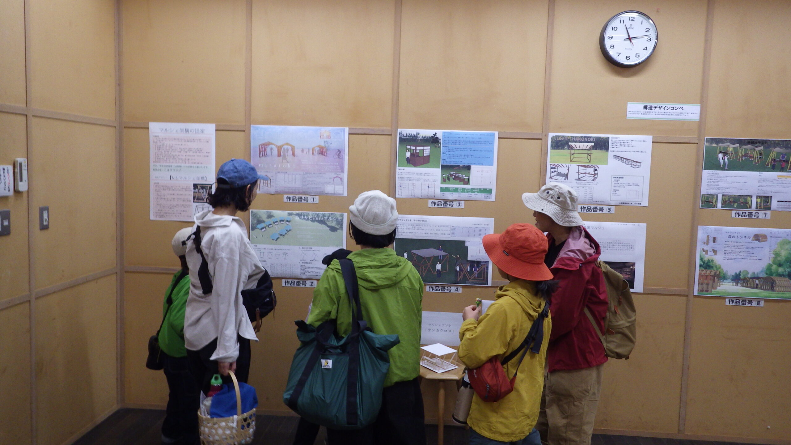 木構造設計(マルシェ構造架構)提案では、各学生の設計提案に関して翔楓祭来場者による設計作品への投票会を行いました。