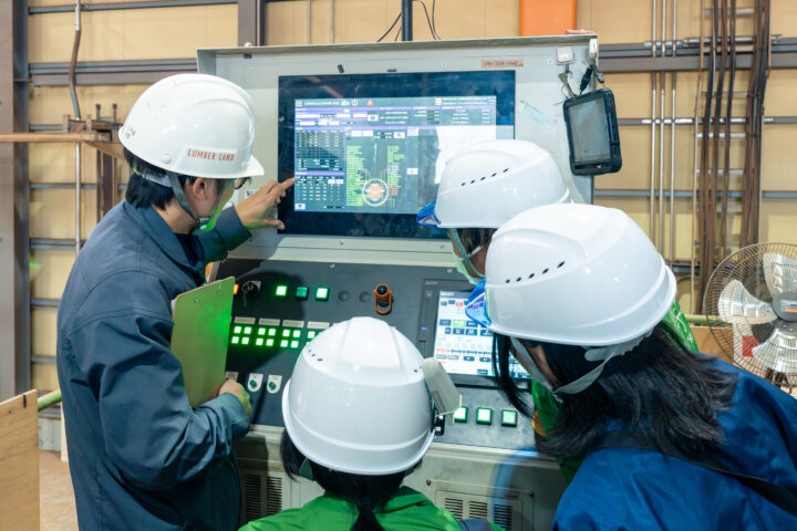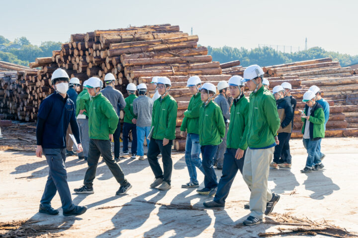 エンジニア科1年生「木材流通の現場見学」の授業では、現代の木造建築の柱や梁に多く使われる「集成材」ができるまでの流れと今や木造建築の建て方の主流となっているプレカットの工程がどのようにされているのかを学びに行きます。