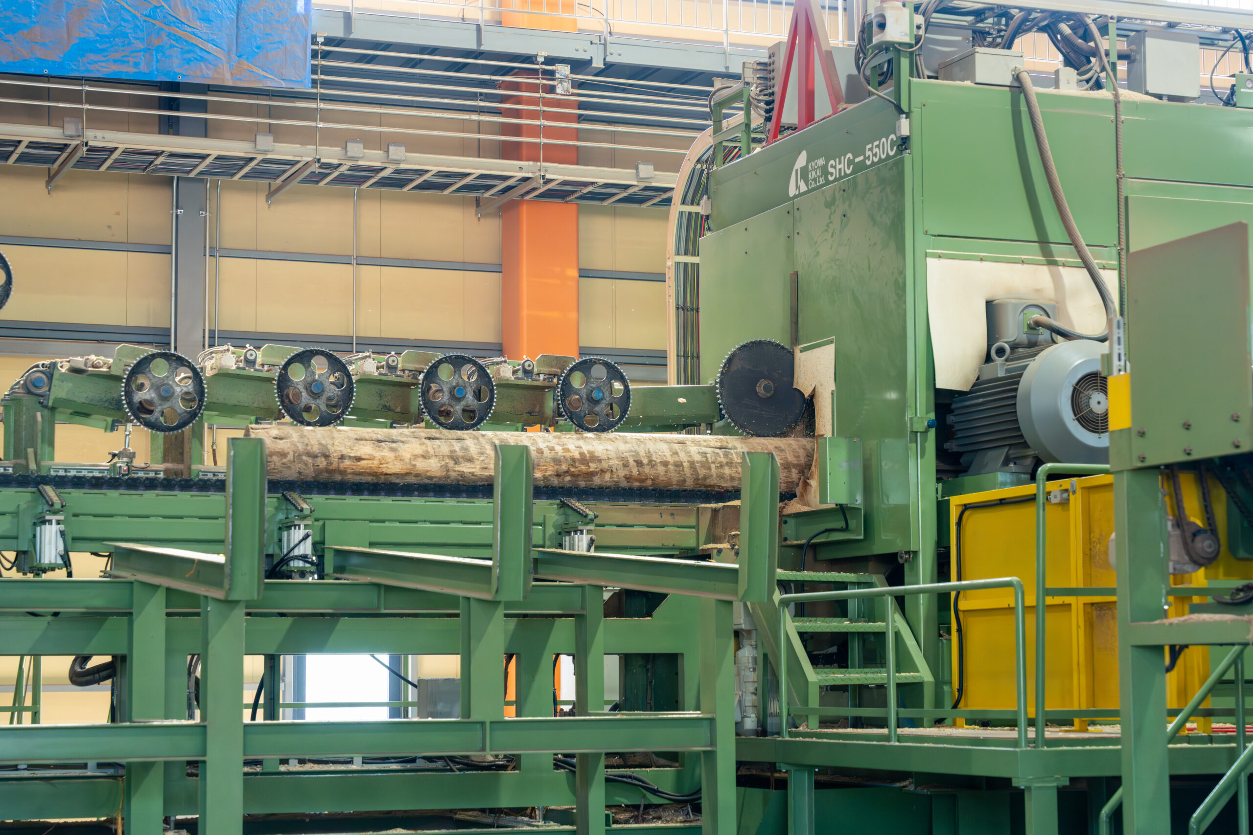 まず、ランバーランドさんは、昨年完成したばかりの主に丸太の原木から集成材用の板(ラミナー材)に製材する会社です。集成材は北欧を中心とした輸入材から製造されるイメージがありますが、こちらは、東海・近畿エリアのスギとヒノキからラミナー材を製造しているのが特徴です。