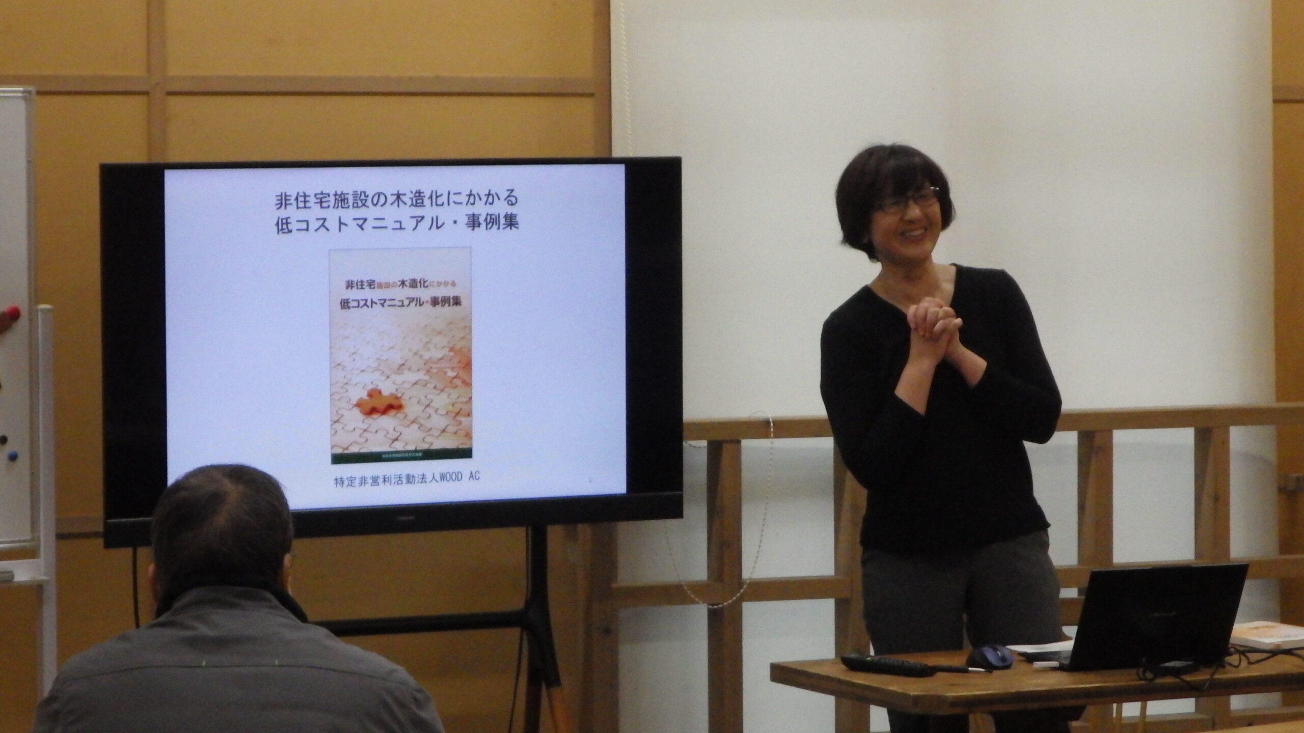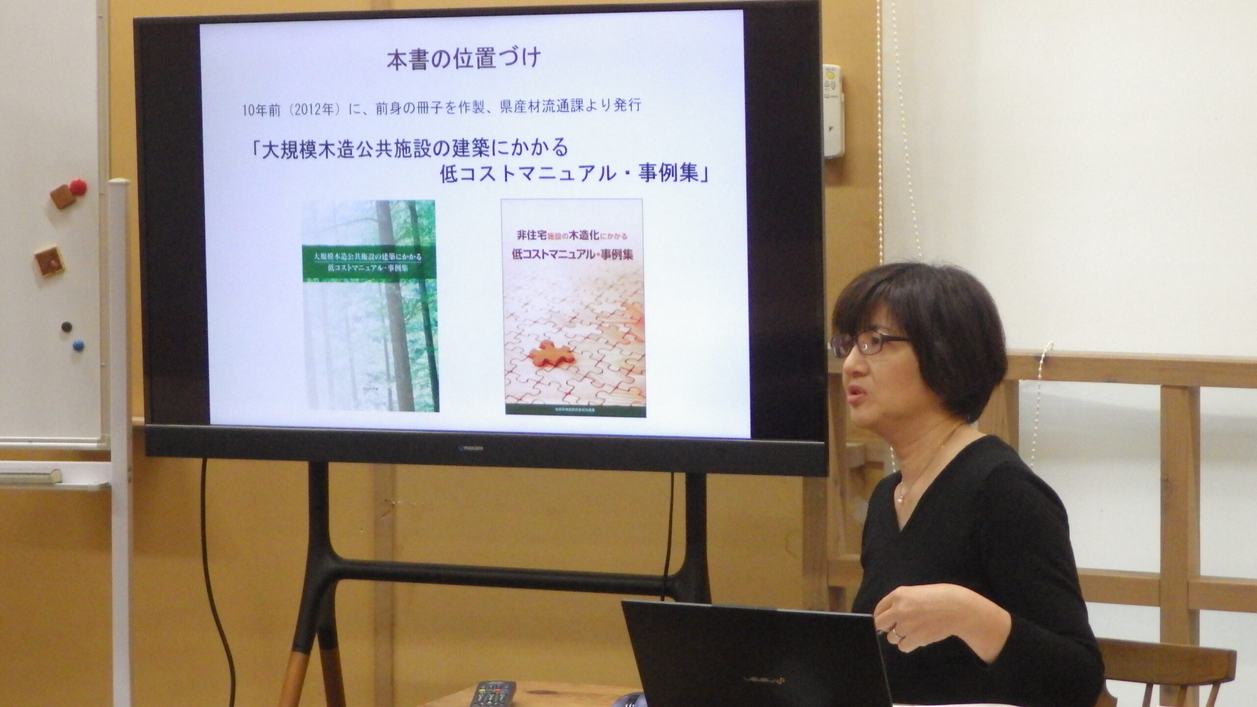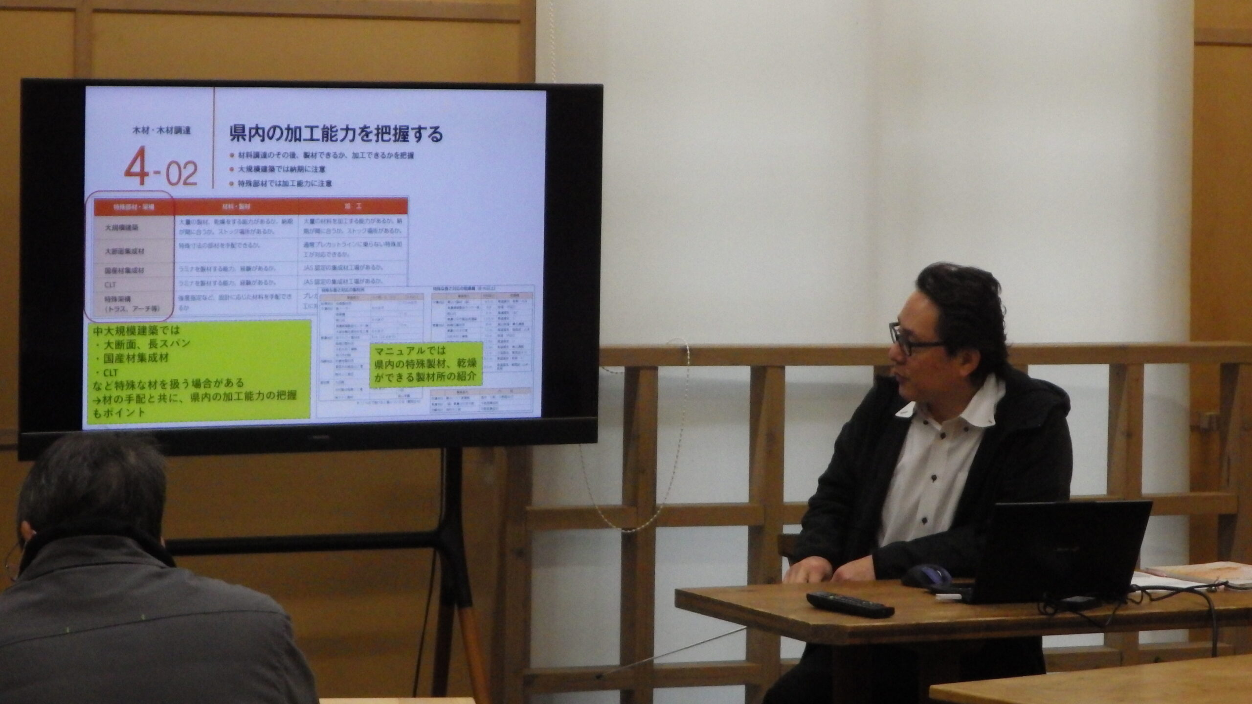 「非住宅施設の木造化にかかる低コストマニュアル・事例集」をひととおり説明がなされました。木造化に係るいろいろな課題があることが分かりました。そういった課題は一様に解決できることではないので、設計者さんや工務店さんなどがケースバイケースで対応していく必要があります。それらのどのポイントに課題があるのか、それらの課題に対してどのような解決方法があるのか、などのお話がありました。