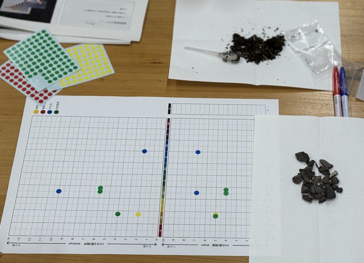 特に、土の色は地域特性が出やすいとのこと。土、よーくみると、黒いだけでなく赤や黄色が混じっていることに気が付きます。