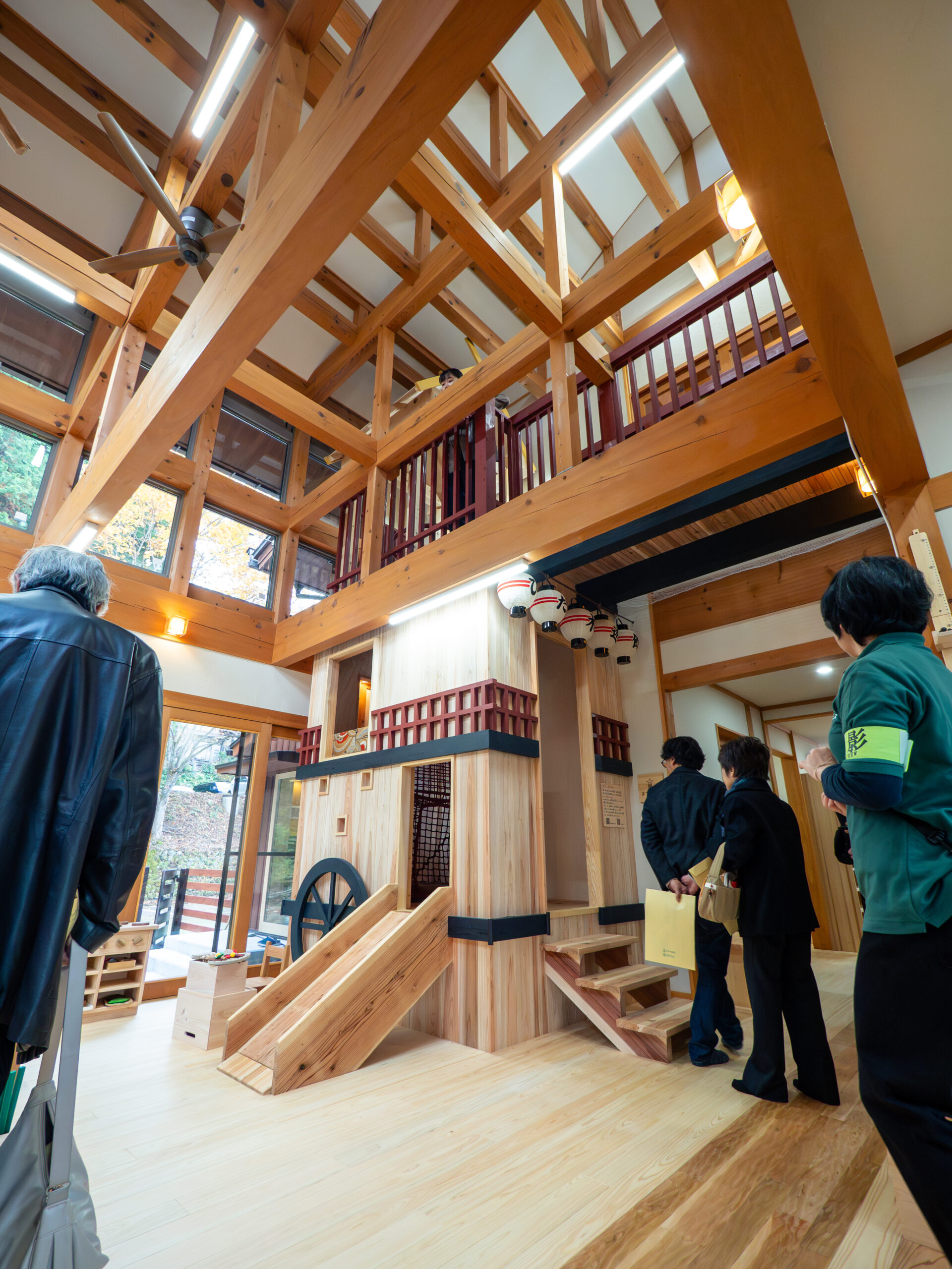 そして、1階から2階へは吹き抜け空間を使って、高山の祭屋台を模した大型遊具を置いて、その遊具の中を子供たちが2階へ登れるようにして、上下階の遊びの空間に連続をもたせる仕掛けをしました。