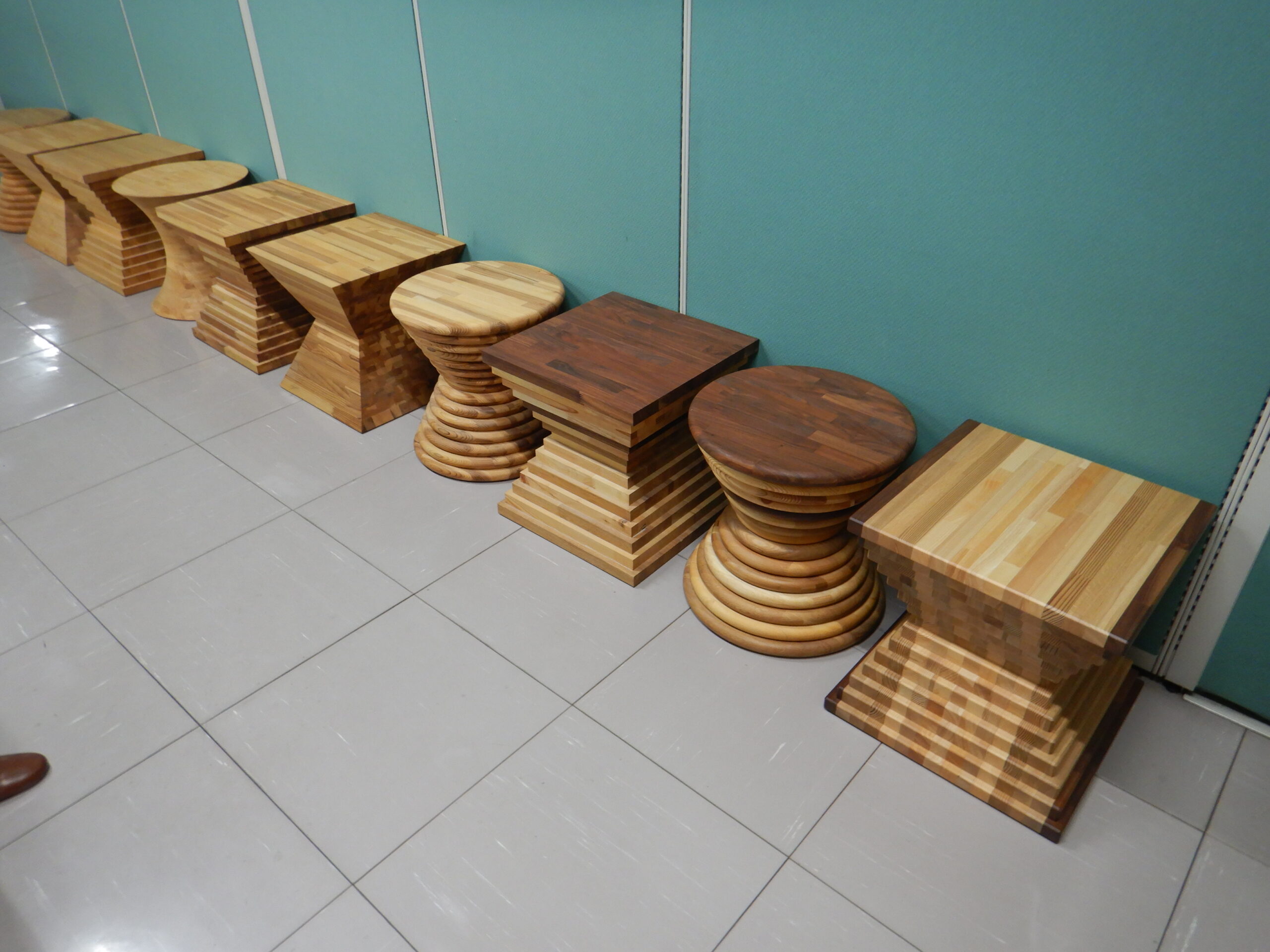 応接室の前には、展示会用のスツールも並べられています。いろいろな樹種が使用されており、木材担当の教員としては興味をひかれます・・・
