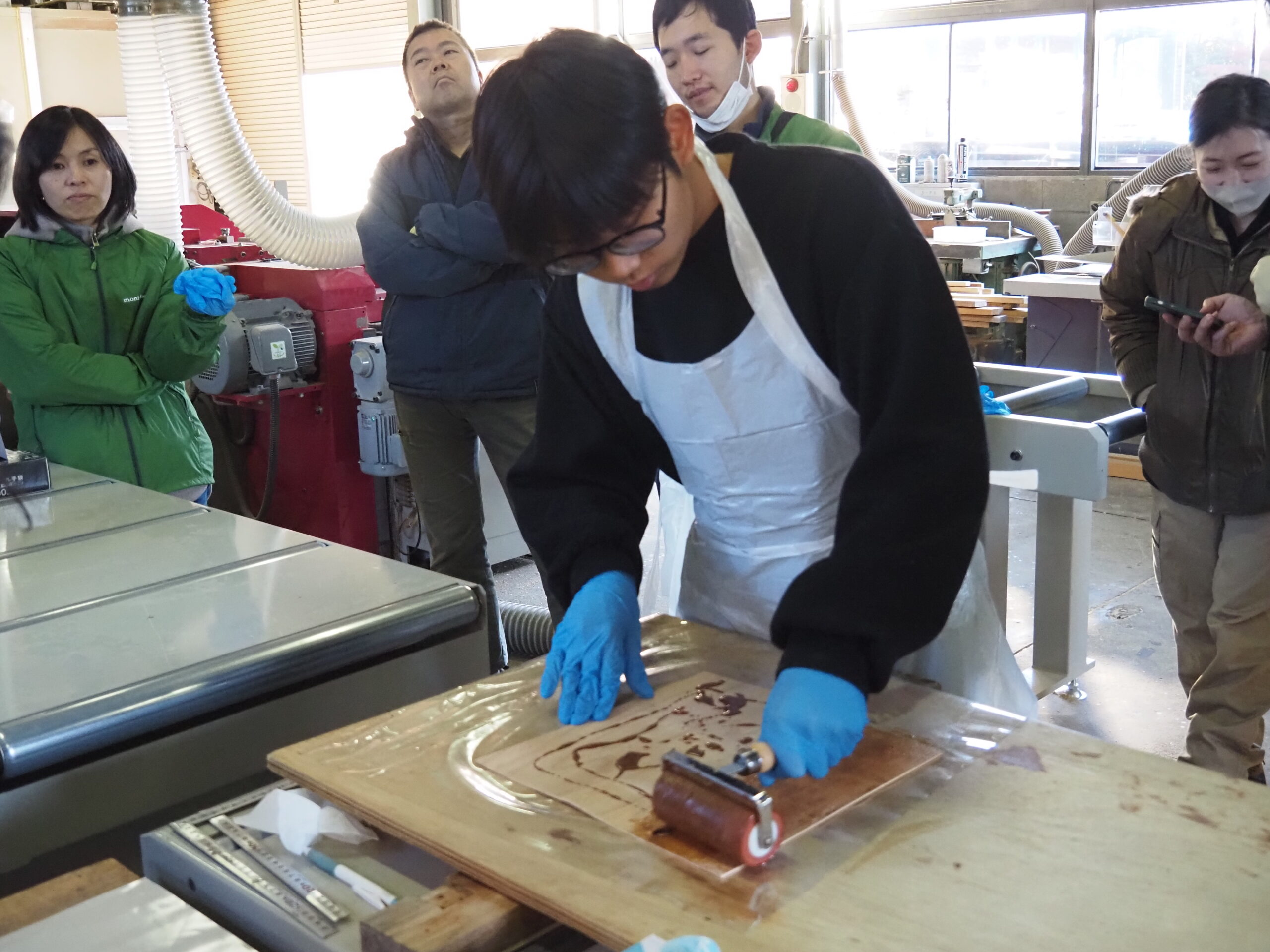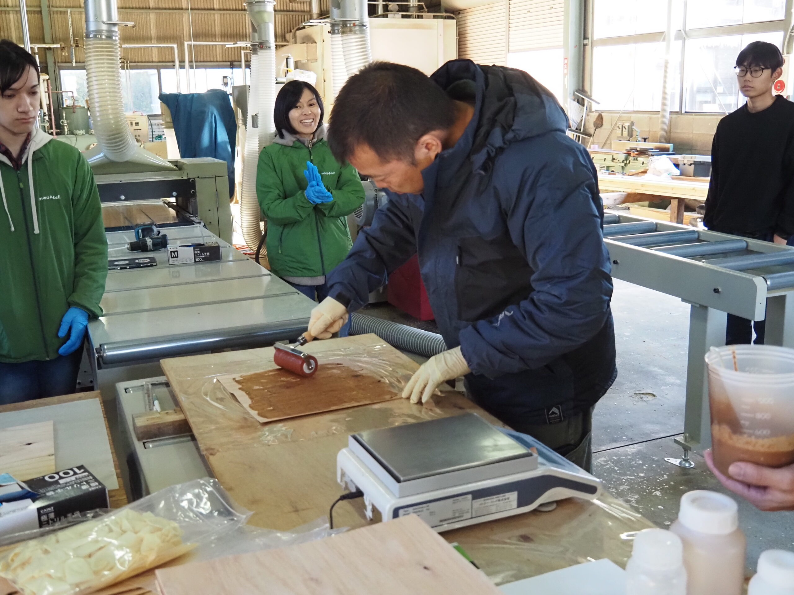 その後、約30センチ角(5層構造、厚さは12ミリ)の合板を製造体験をしました。