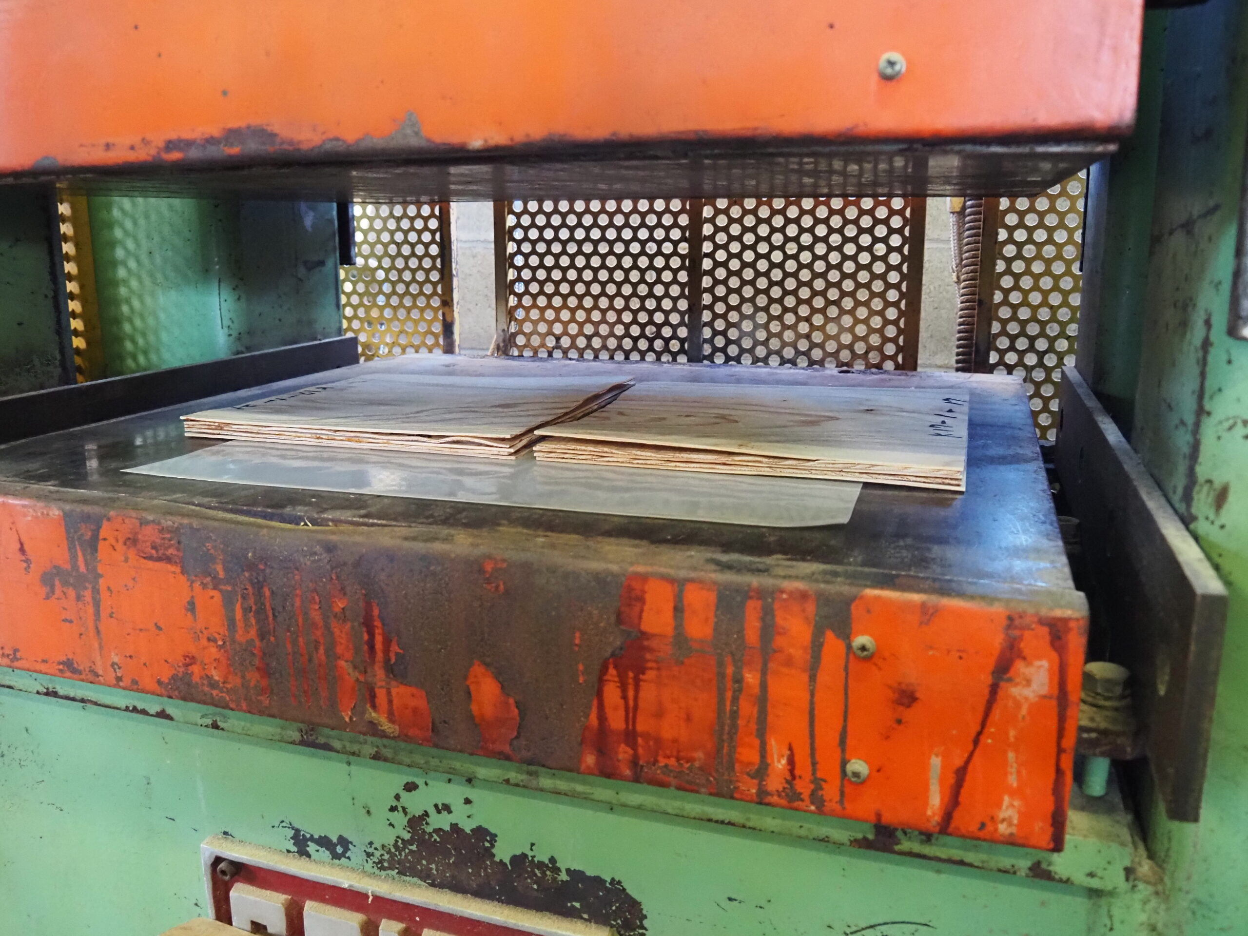 単板を重ね合わせ、ホットプレス(130℃)で7分半圧締しました。