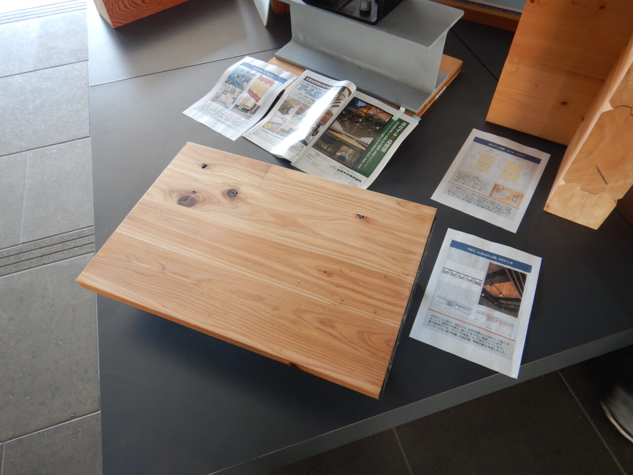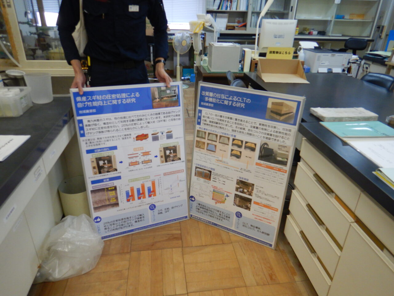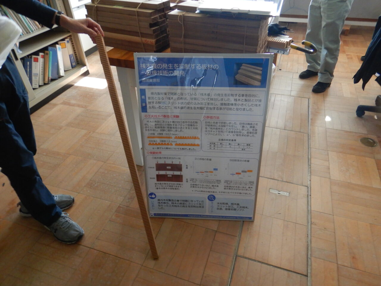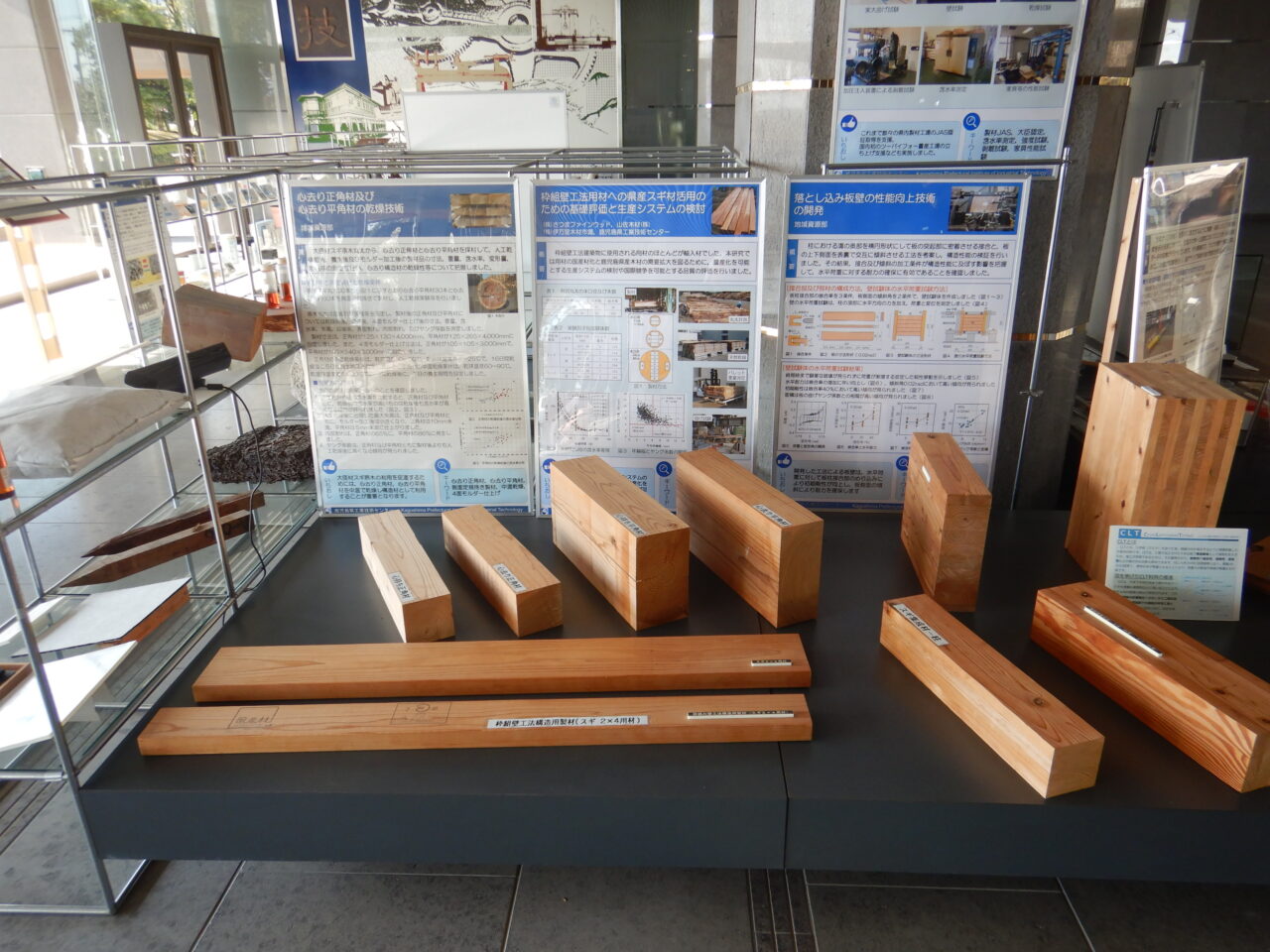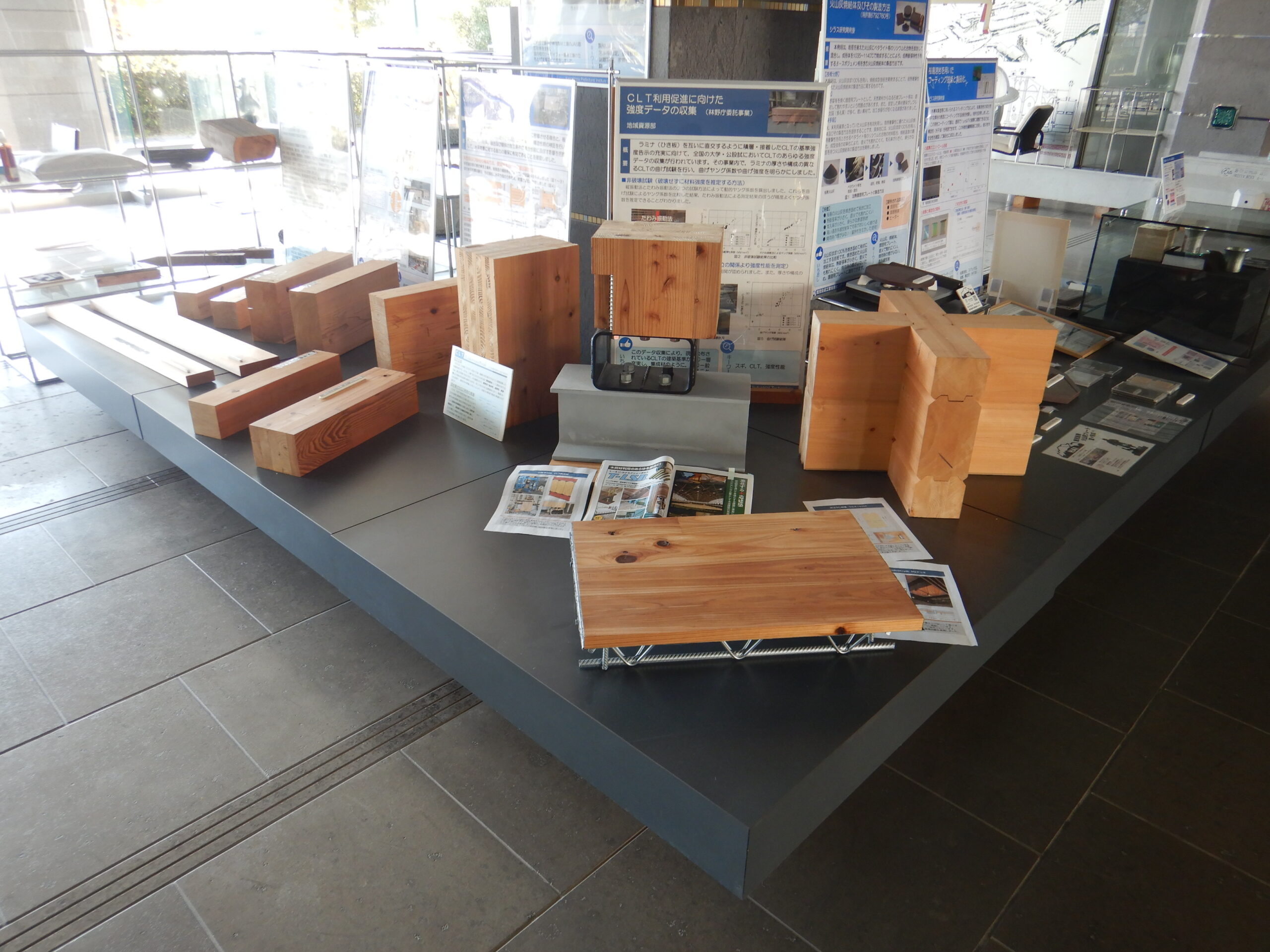 木材に関連する成果品も展示してあります。鹿児島にはCLTのJAS工場があるので、CLT関連の研究も盛んです。