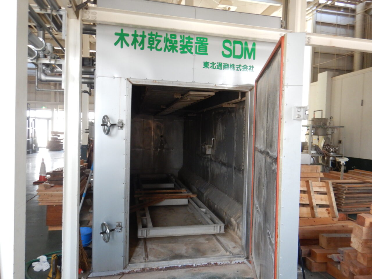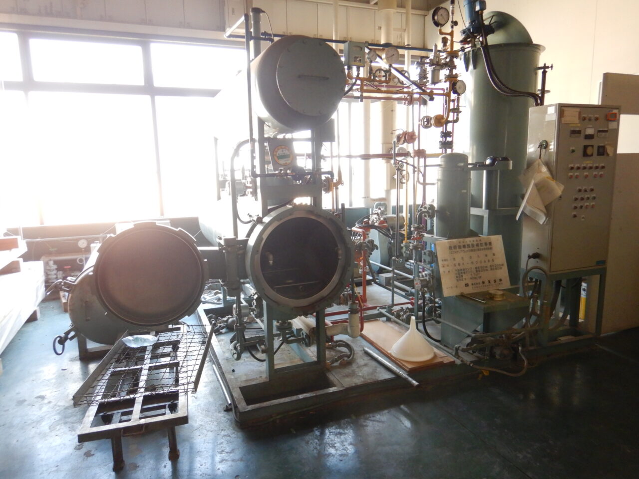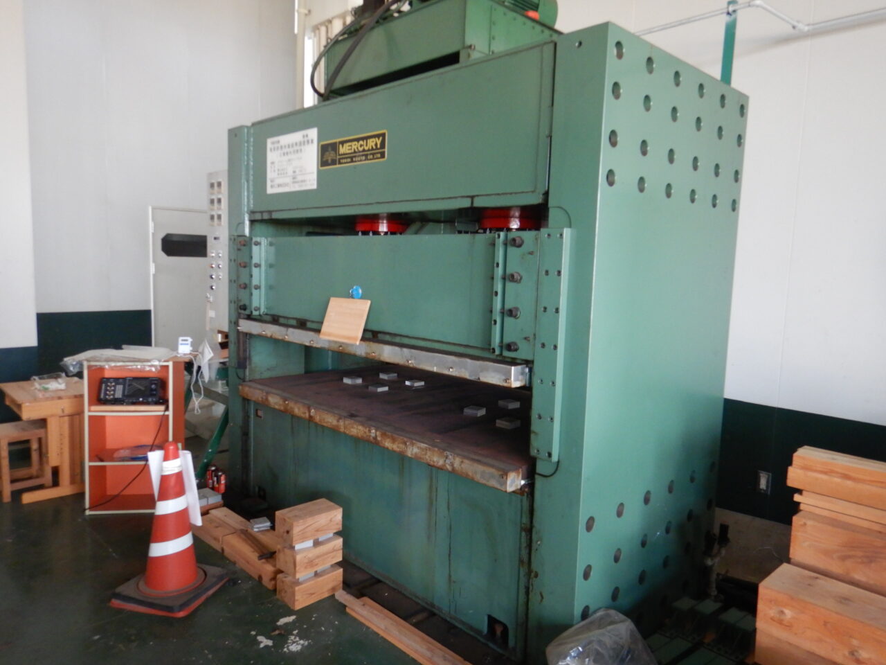 合板サイズに対応したプレスや薬液注入用の圧力容器(現在では専ら接着剝離試験に使用しているそうですが)、スライサーなどもありました。