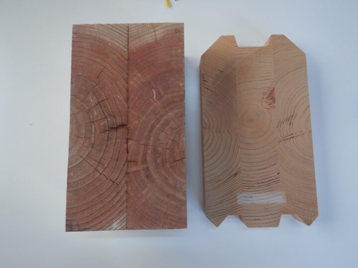 同社の生産する合わせ材は、耐朽性向上や、表面割れの防止の観点から、木裏が表面側になるように接着されています。
