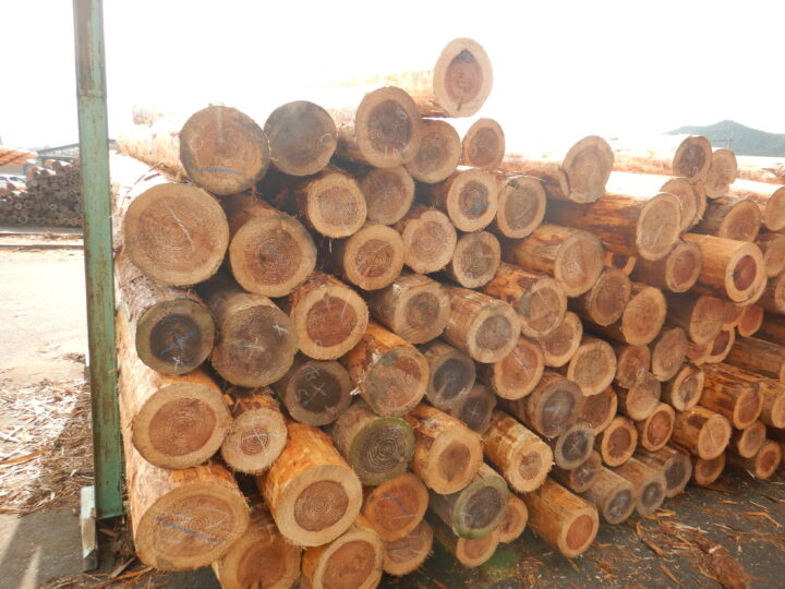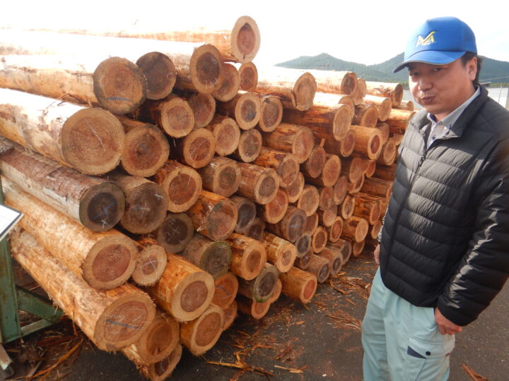 原木土場では、概ね2000㎥の原木をストックしてます。県内8か所の共販所などから仕入れているとのこと。