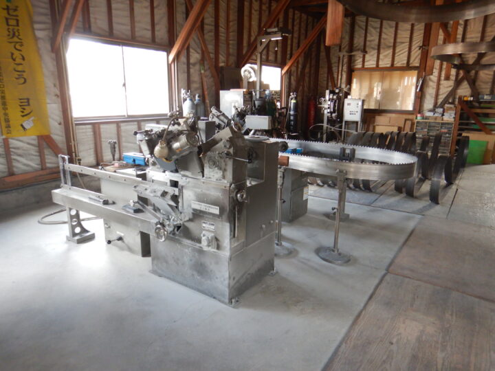 昨今、帯鋸の目立て業者の減少が全国的な課題となっていますが、同社では目立てを自社で行っているそうです(アカデミーにも昔は目立て機があったのですが・・・泣)。