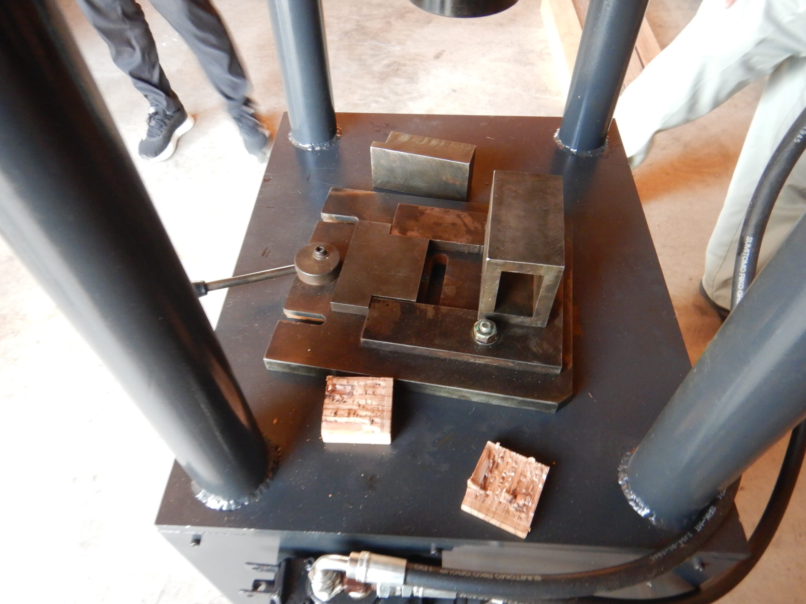 こちらは接着性能評価のための加力装置(せん断強度試験機)。なんと、「強度試験機が高いから」・・・と、試験治具を含めて工場長が自作されたものです。