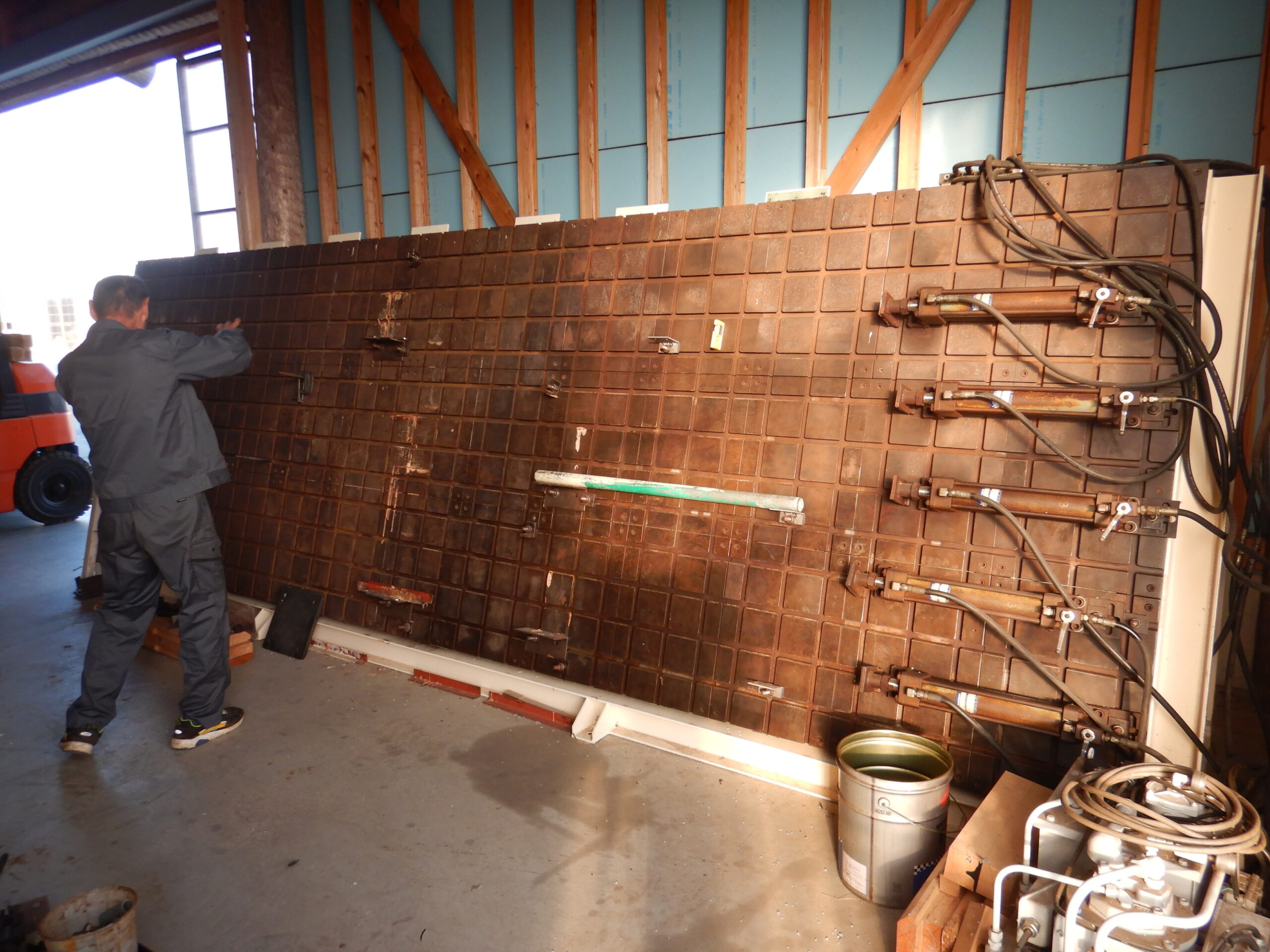 珍しい曲面プレスも設置されていました。これは治具を平板上の任意の位置に設置することで、あらゆる形状で接着ができるものです(ただし、現在では専ら縦継ぎ用のプレスとしてしようしているとのこと)。