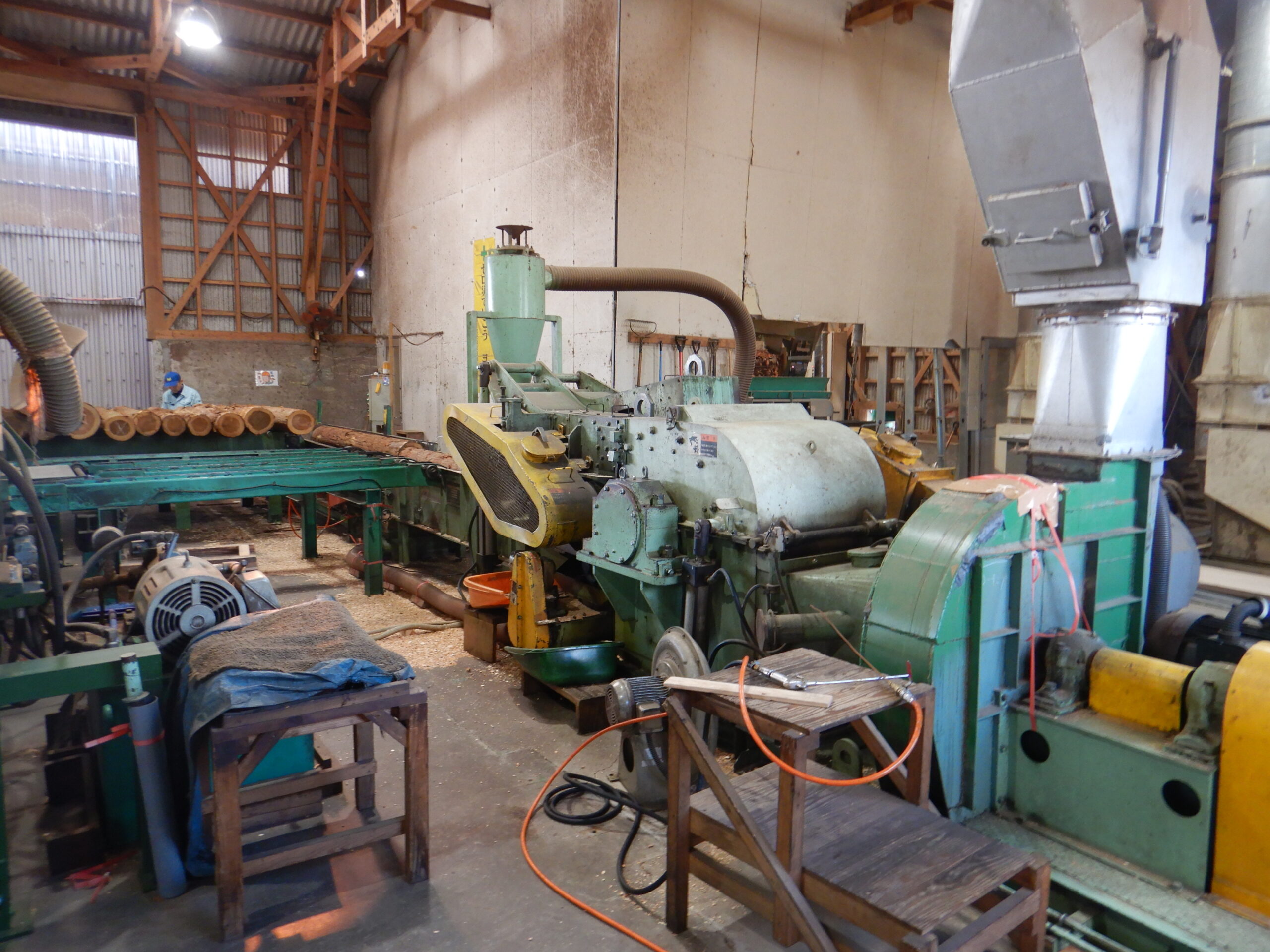 形状が不良であったり大きすぎる原木は、おが粉等になるのですが、サイズによってはこちらの縦割り機である程度細かくしてから破砕します。