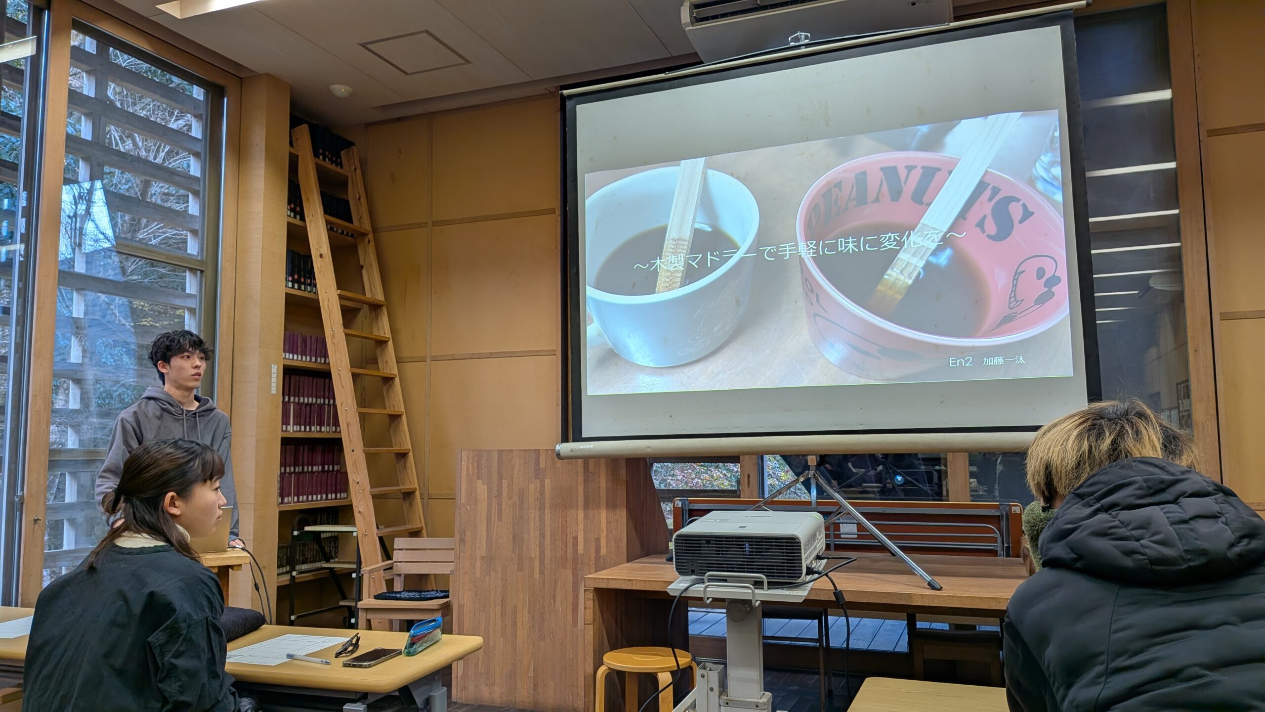1人目の発表者はコーヒーが好きだという加藤一汰さん。「インスタントコーヒーの味を、木製マドラーで手軽に変えれるか」という課題に取り組みました。