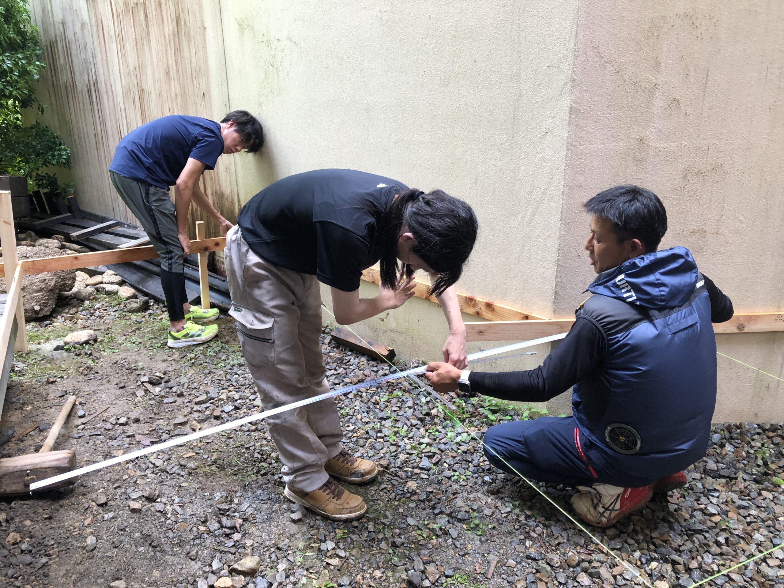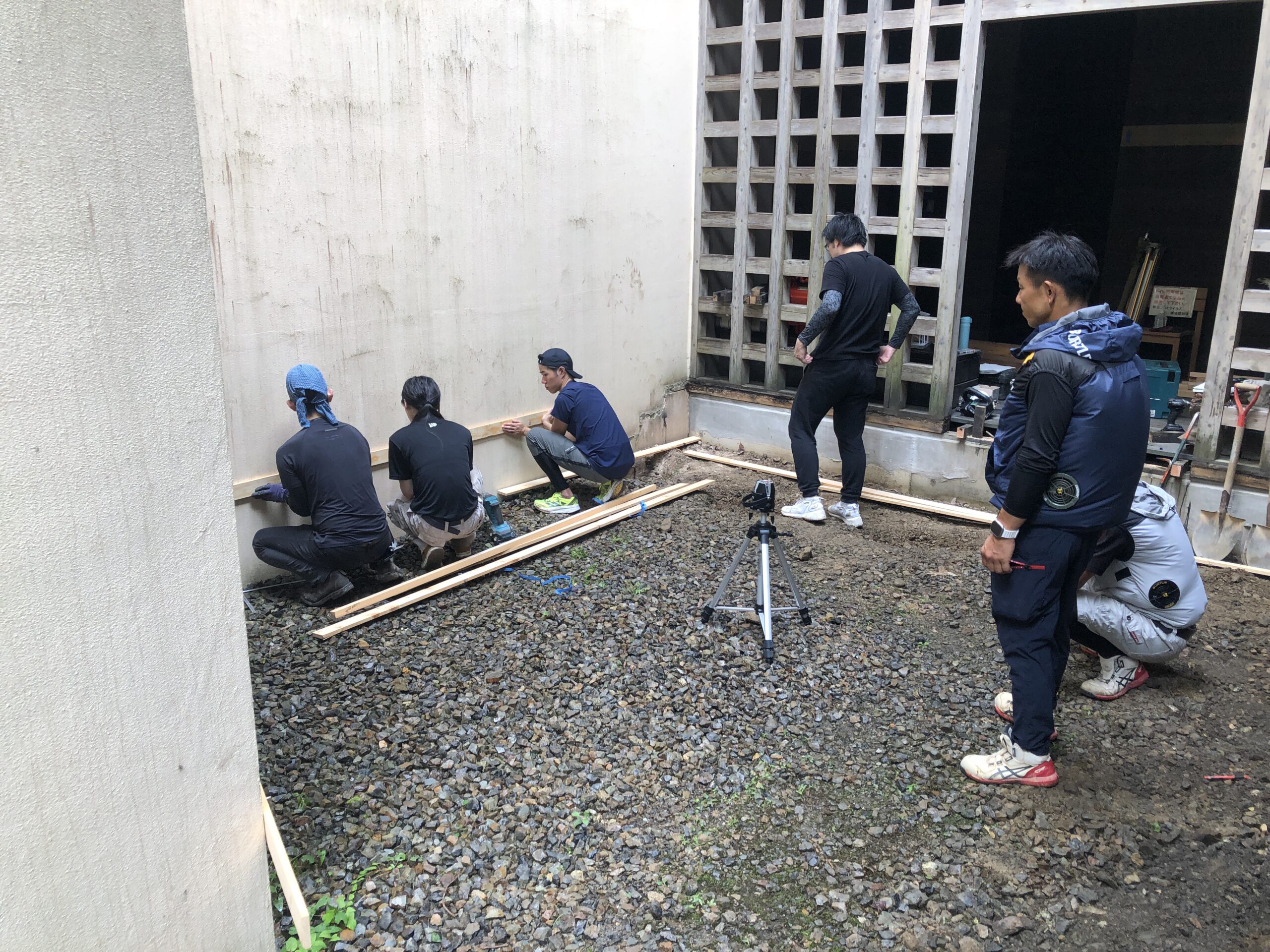 建物の配置の確認と基礎工事の準備のために丁張(遣り方)を行いました。