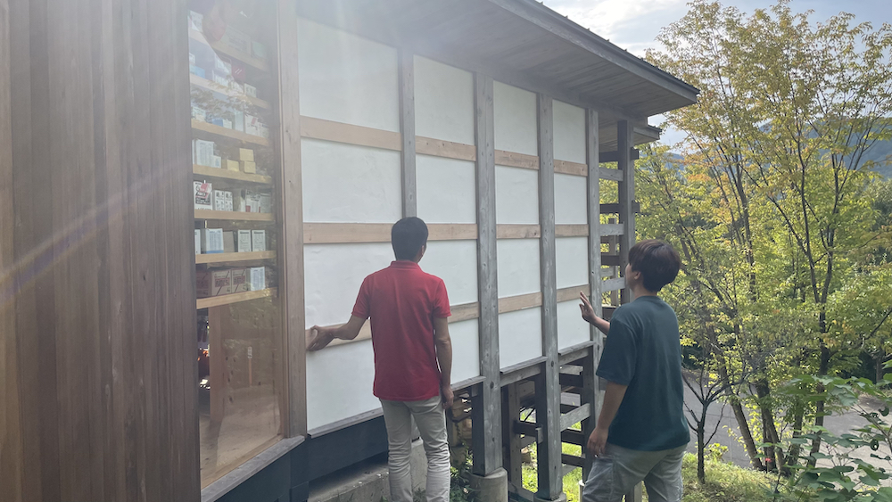 安井先生に22期の自力建設の説明をする棟梁。外部に使った漆喰は不燃材料と言って火事に強い素材です。