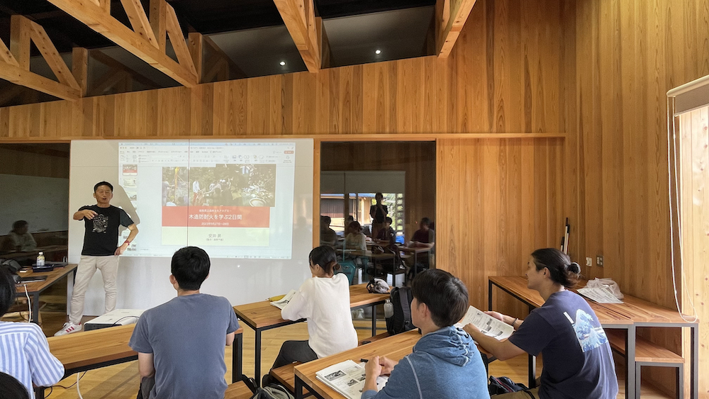 今年は「林業機械学習棟」で講義をお願いしました。いつも元気でおしゃれな安井先生。わかりやすい授業に学生も集中です。