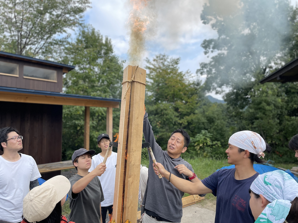 恒例の「焼杉実習」。内部は燃えているのに外側は熱くない。火が成長する性質と、木材の性質を理解するのにもってこいの実習です。