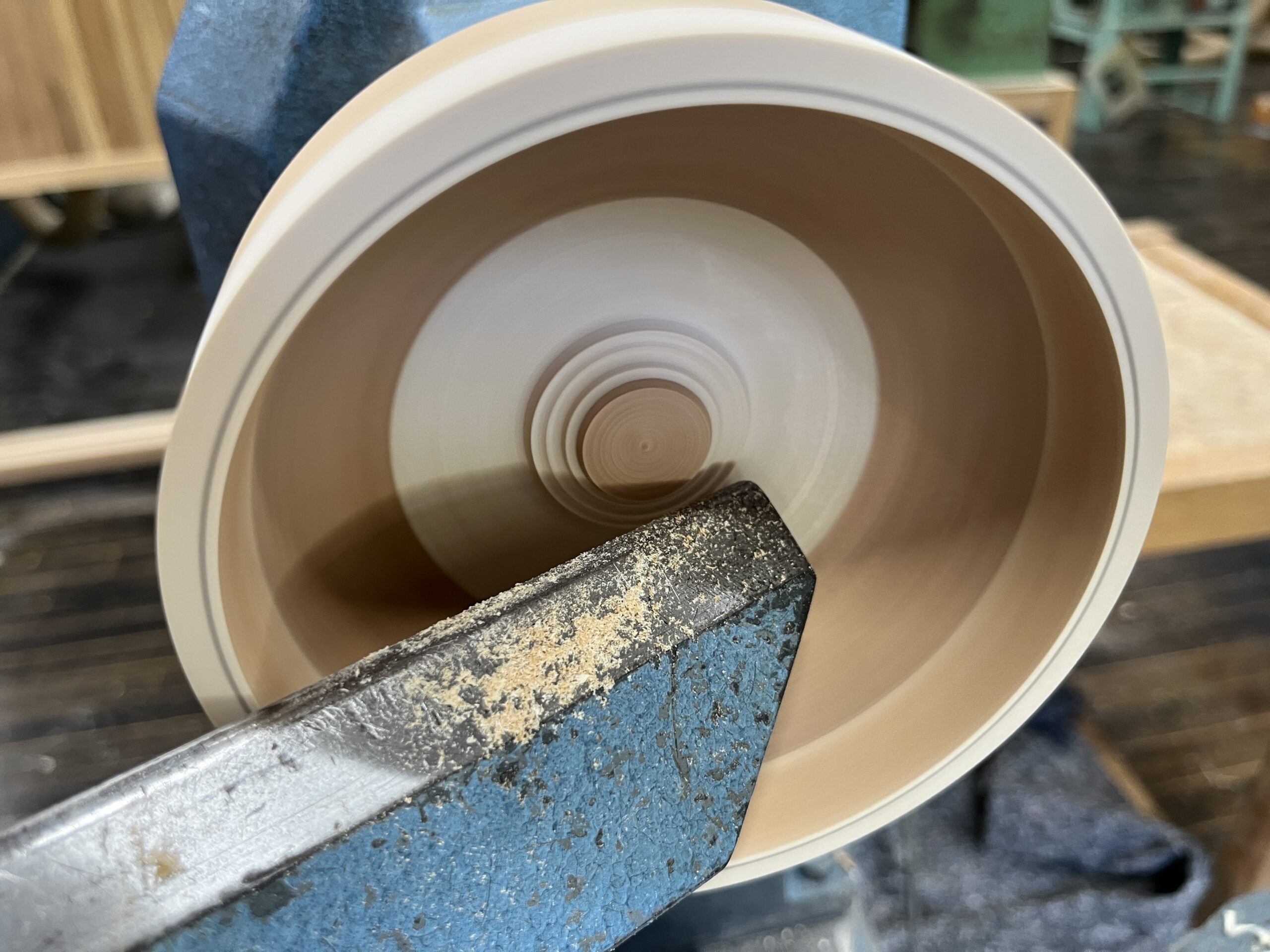木工旋盤では、一般的に厚みのある材を刃物で加工していきますが、今回は薄い材を積層することにより厚みをだしてから加工することにしました。