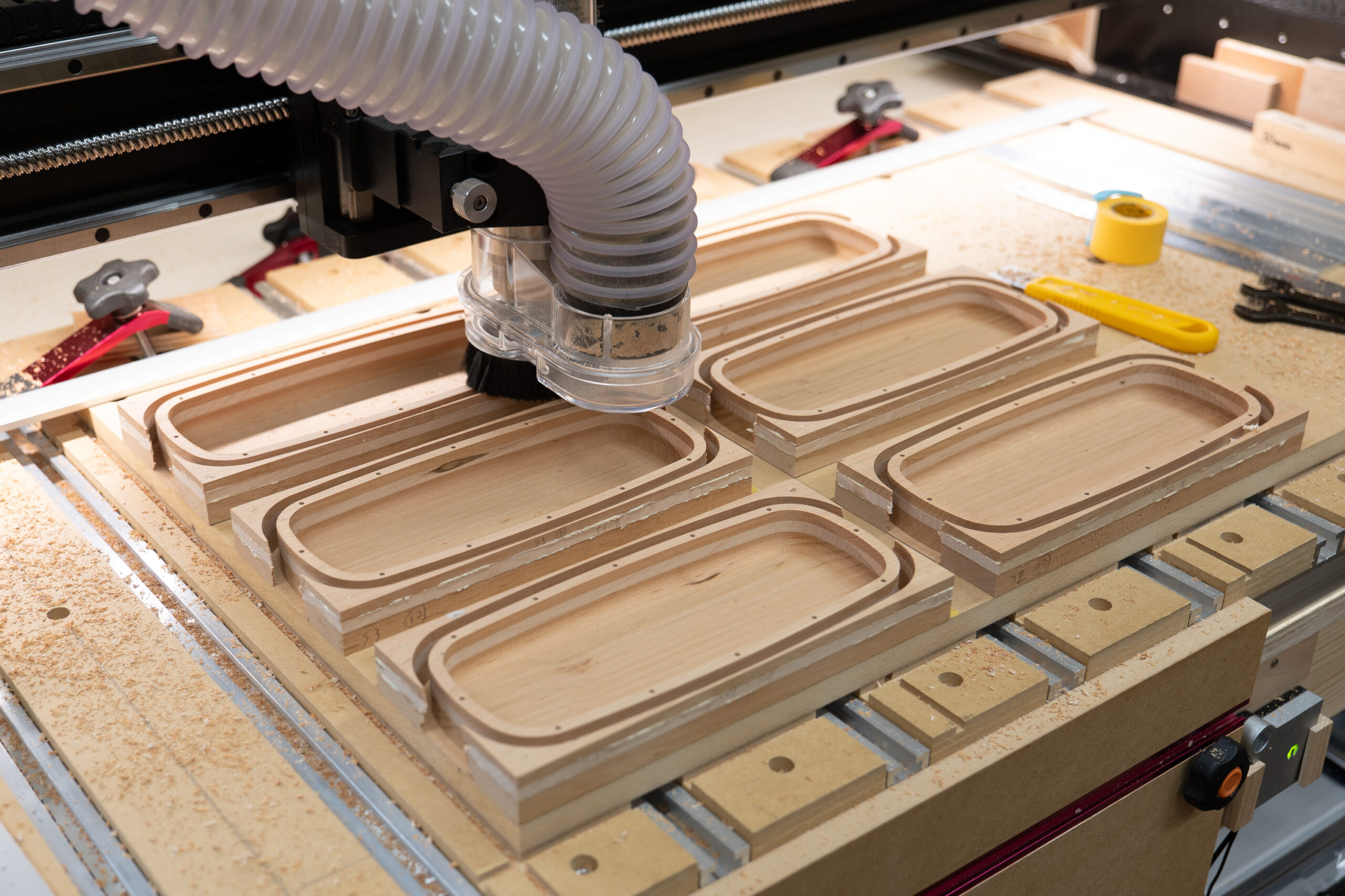 もともとは、一般的な四角い板を組み合わせた構造を考えていたのですが、木の伸縮率が木目の方向によって違うことを考えると、どうしても汁もれの可能性は排除できないことから断念。先生のアイデアで、板をCNCでくりぬいたものを積層することで、直交するつなぎ目のない構造としました。