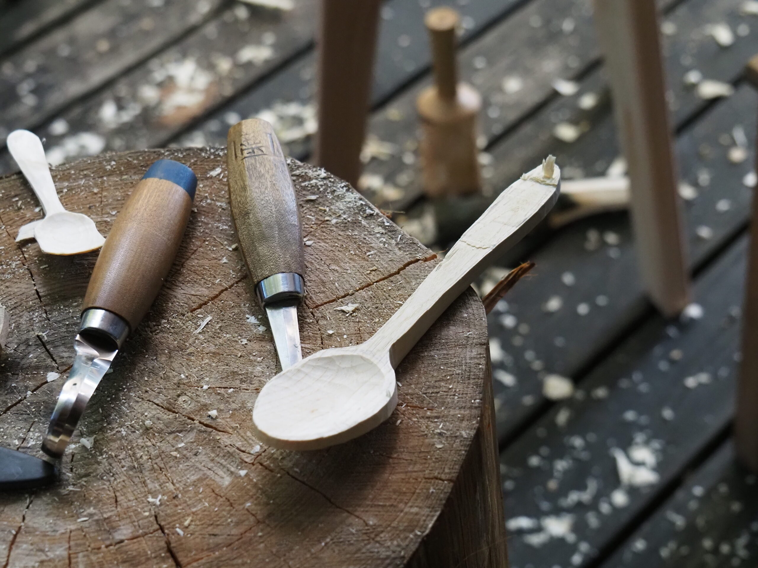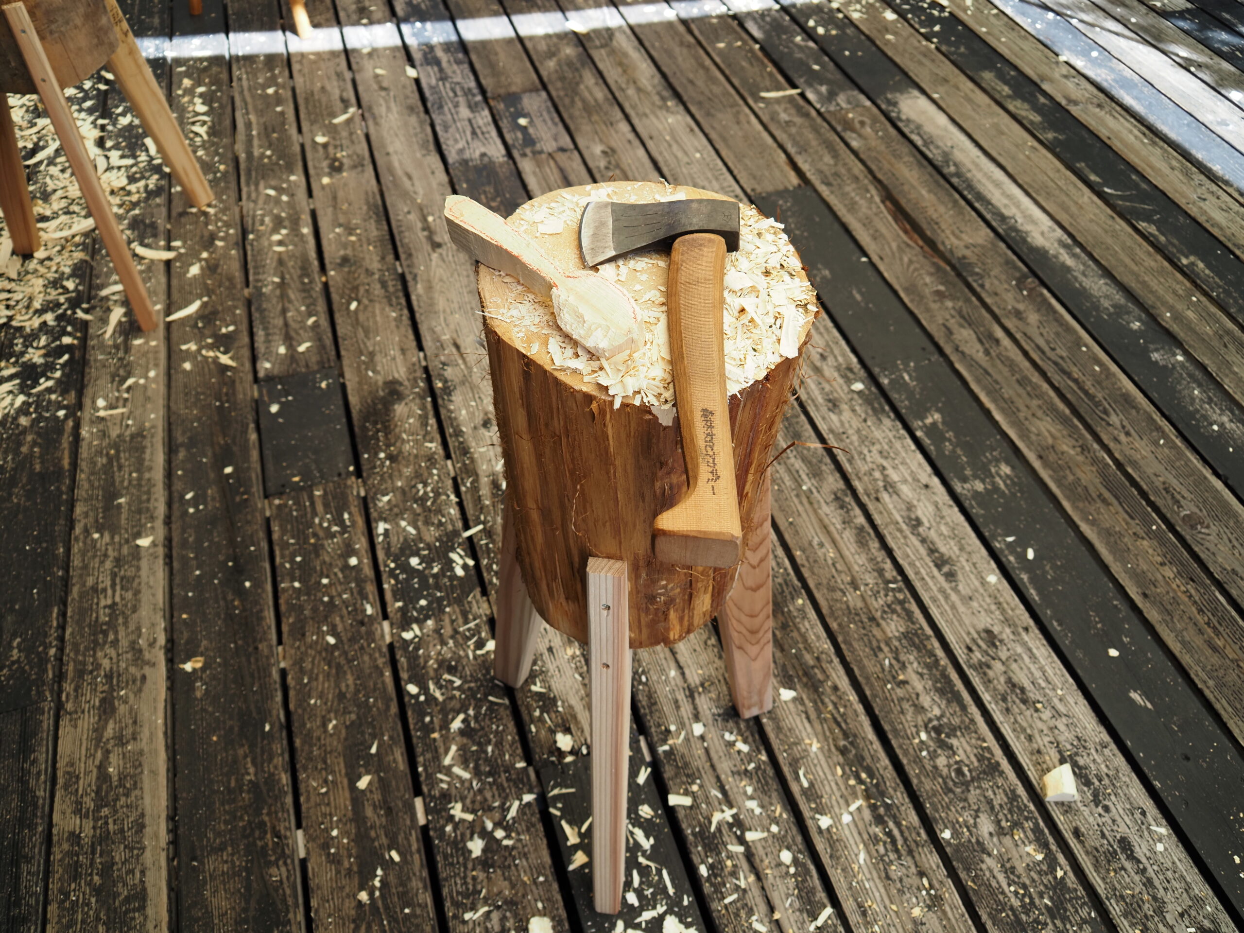 アカデミー内の樹木の枝を採取し(切る)、斧で小割にして(割る)、スプーンを作ります(削る)。