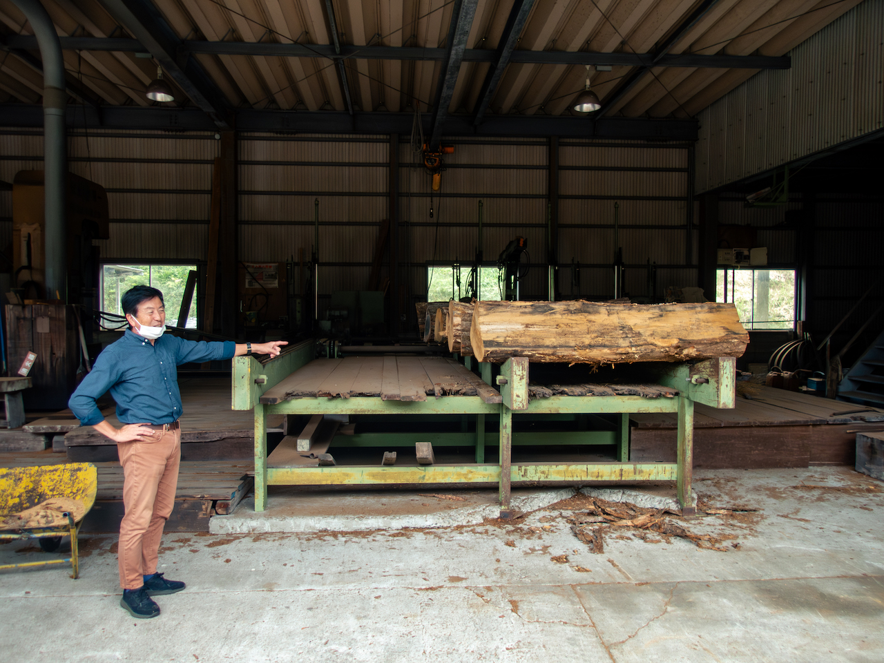 今回、製材された広葉樹のご説明頂きながら、板材を購入させていただきました。こちらで製材される広葉樹は、入荷した広葉樹のうち、わずか数%で、年々その数も減少傾向とのことです。その背景には、主に広葉樹の原木の取引単価の下落と広葉樹の施業には補助金が付かないという現代の林業の厳しい状況があります。そんな今や貴重な広葉樹ですが、こちらではイタヤカエデ、オニグルミ、サクラ、クリは数ある樹種の中でも取引が多く人気の樹種です。他にもトチやブナ、ホオノキ、ミズメ、ナラ、イチョウなど数多くの樹種の取扱があります。今回は、2年生の学生がイタヤカエデを購入しました。なお、こちらは大型の取引だけでなく、少量の購入も対応していただけるので、個人で活動されている作家さんにも大変良心的です。