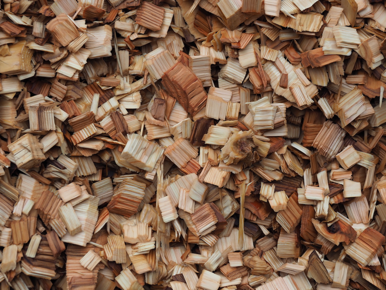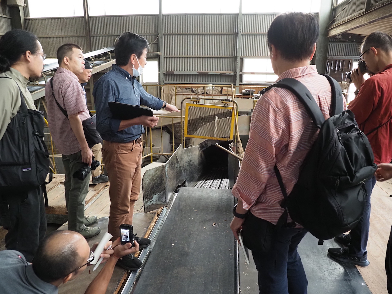 実際にチップの製造ラインの一部を見学させていただきました。まず原料となる丸太の皮剥きをしたのち、21枚もの刃物が付いた裁断機で丸太を刻みます。次にスクリーンでふるいをかけて粗さを揃えます。この裁断とふるいの工程を繰り返して、出来上がったチップは、通常2〜4mm程度の大きさになりますが、食品製造向けは1mm程度のより細かいものになります。そして、製造ラインから出てきたチップは、天然乾燥を経て出荷されます。