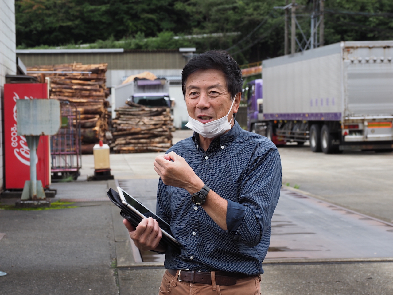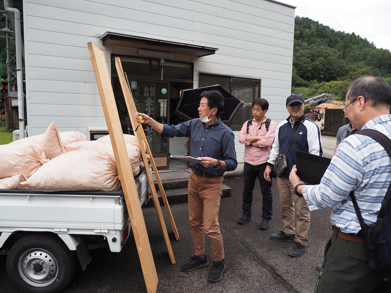 1件目は下呂市にある「株式会社金山チップセンター」を訪問しました。こちらの主な事業は、大手製紙会社向けの木材チップ製造ですが、他の用途のチップ製造や広葉樹の製材販売、家具の製造販売など幅広く事業をされています。こちらの製紙以外の用途の木材チップとしては、バイオマス発電の燃料用チップ、公園やドッグランなどに敷設するチップ、酒造や燻製、きのこの菌床用といった食品製造向けのチップがあります。