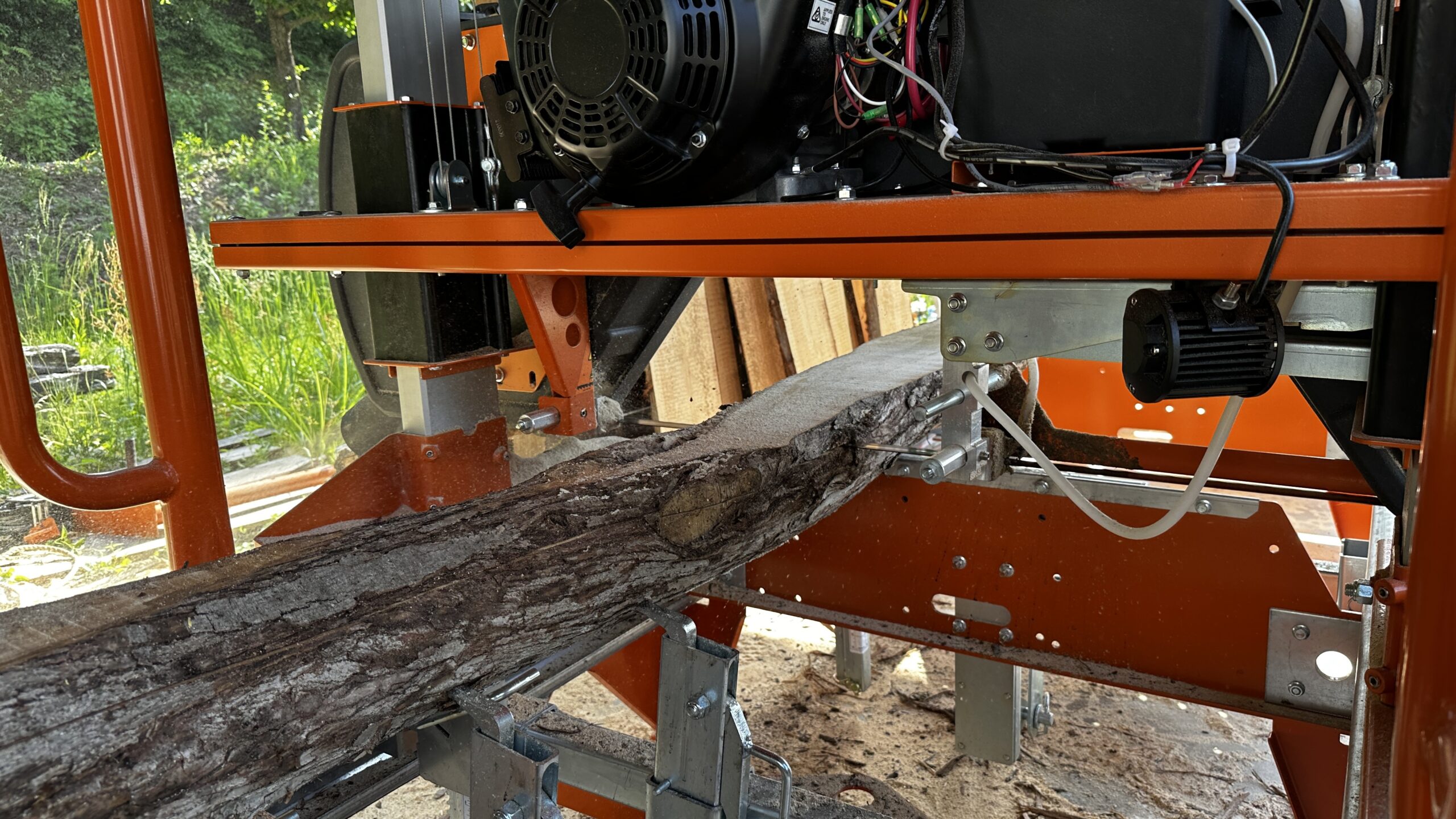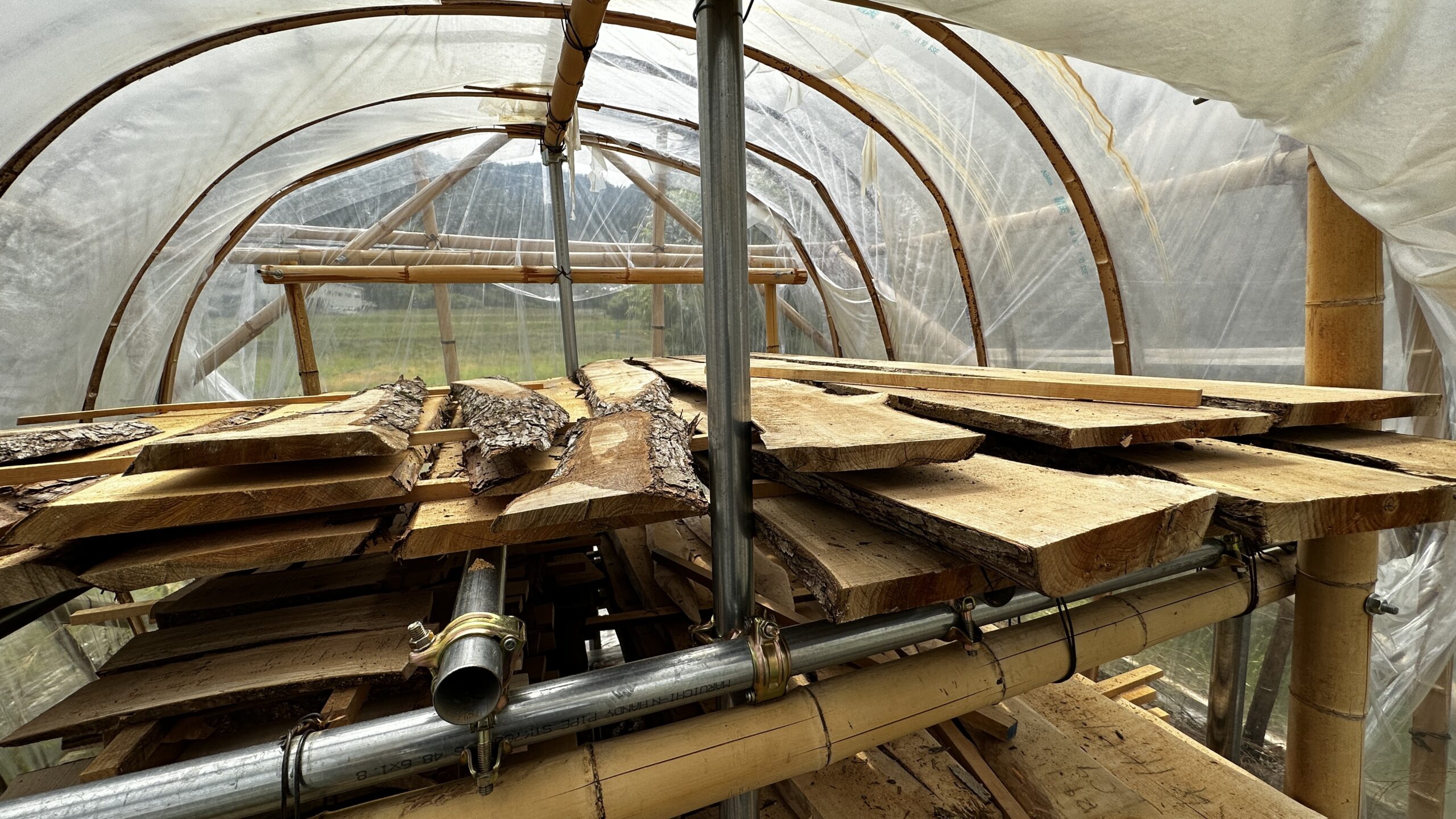 翌年2023年の5月にアカデミーの簡易製材機で製材し、卒業生の渡邉聡夫さんの課題研究「ビニールハウスを用いた低コスト木材乾燥の実施検証」で製作した学内に設置されているビニールハウス乾燥庫で半年間乾燥をさせました。