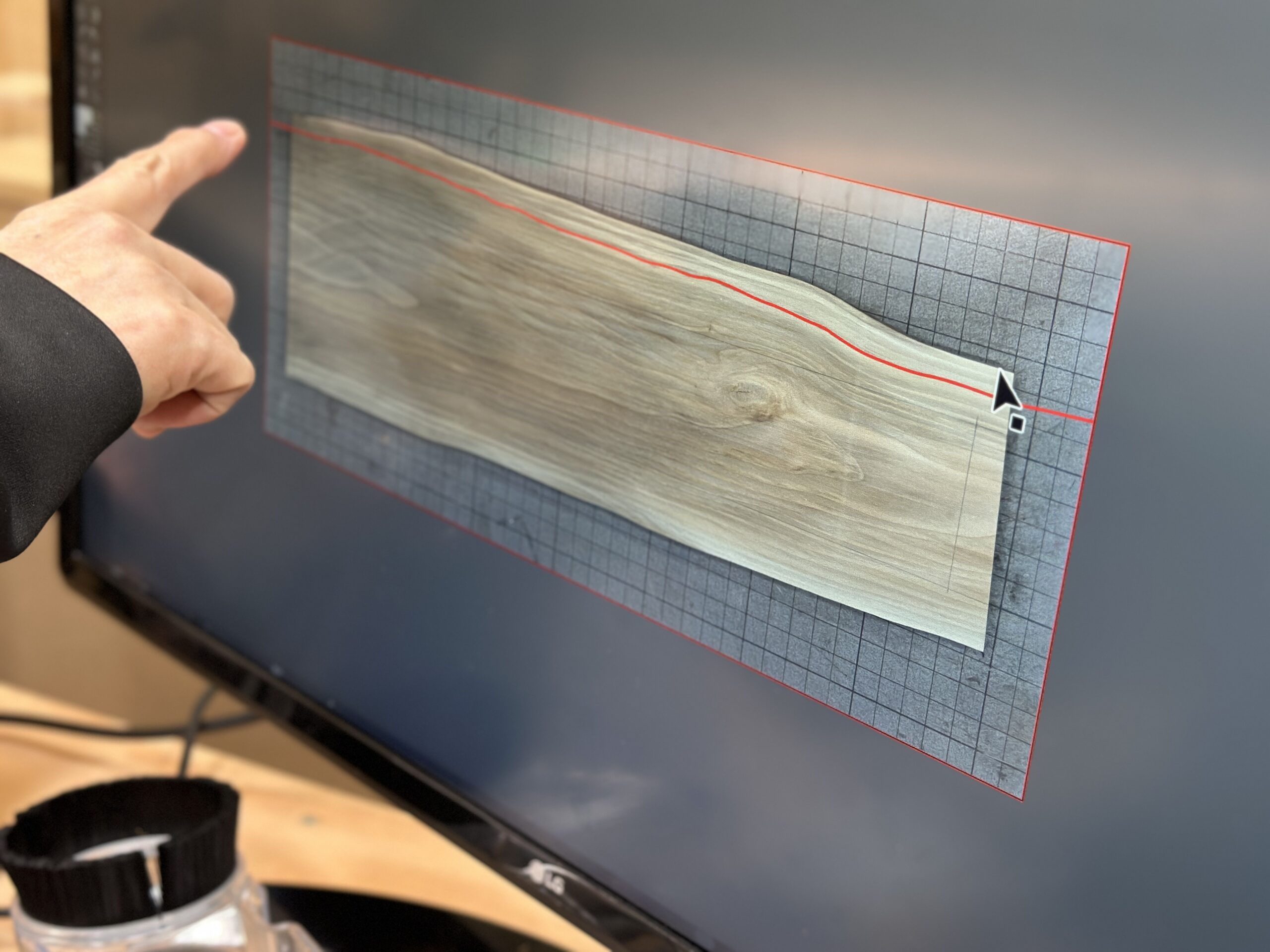 今回もう一つの試みとして、2023年6月頃に製作した情報センターの演台でも試した板の形状に合わせた矧ぎ合わせを、カツラで製作した2台のうち1台の天板でやってみました。前回との違いは材の形を写真で取り込み、材に合わせてデータを作成しCNC加工機で接着する矧ぎ面を加工したというところです。