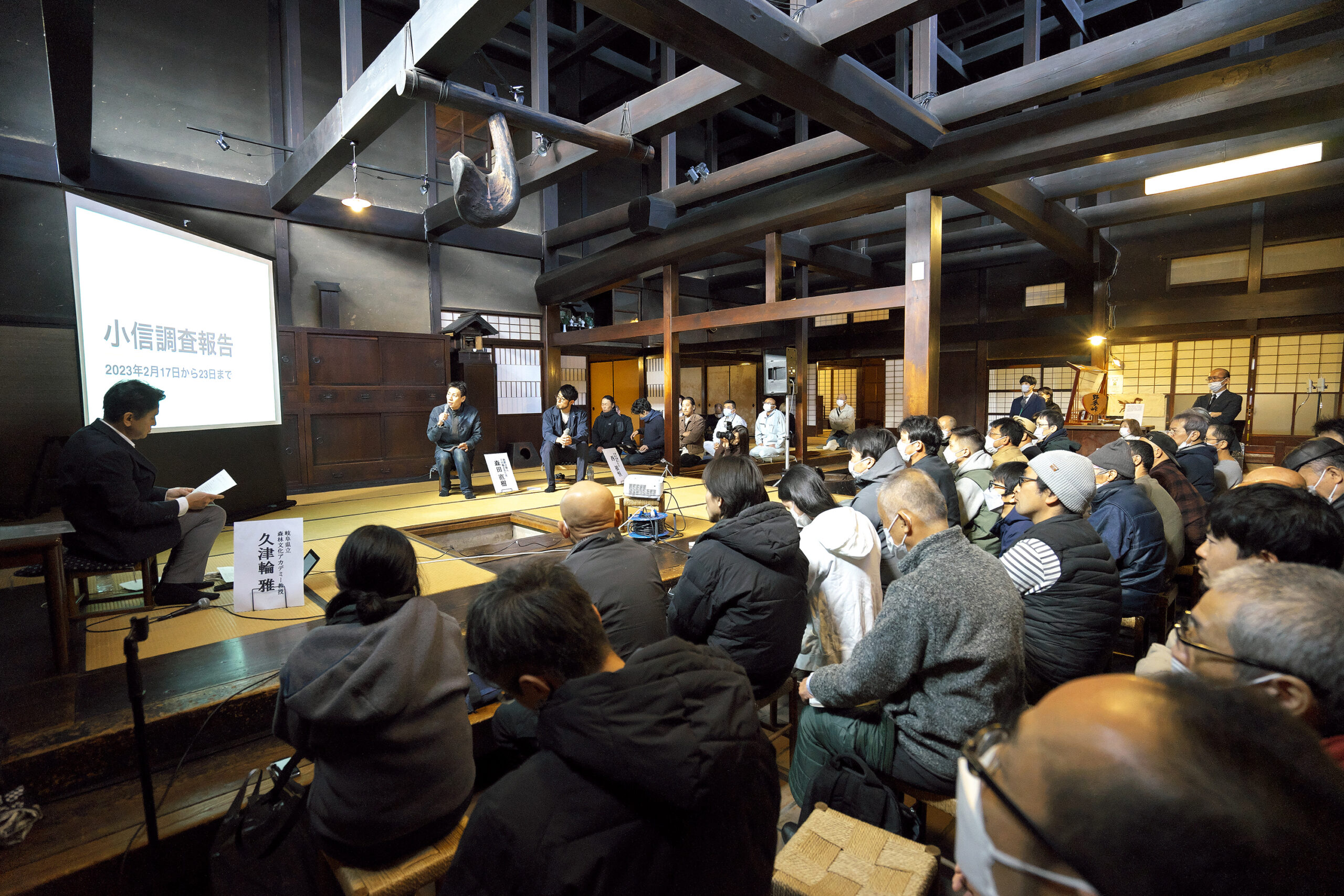 これは岐阜県文化伝承課が2019年度から実施している「匠の技を支える道具の保存伝承事業」の一環で、伝統建築や木工の手道具を作る鍛冶職人の中でも特に高齢化・減少が著しい彫刻刃物の鍛冶職人の現状について共有し、共に考えるための集会です。一刀彫や仏像の彫師、木工家、家具メーカー、木工系学校の教員、県内外の鍛冶職人、関の刃物メーカー、県内外の刃物店、県庁(地域産業課と文化伝承課)や市役所職員など50人が聴講しました。