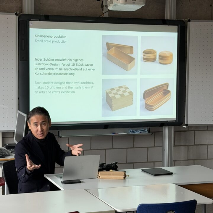 ハインリヒ・ヒュプシュ職業学校(以下HHS)では、クロス先生のはからいで職業学科の3年生のクラスでミニ授業をさせてもらいました。岐阜県と森林文化アカデミーの概要を20枚ほどのスライドにまとめて持参しました。当初は短時間の予定だったのですが、だんだん調子が出てきて・・・アカデミー2年生が弁当箱製作に取り組む「商品化」の授業説明のところで「みなさんはお弁当箱を使っていますか?見せてくれますか?」と聞いてみました。