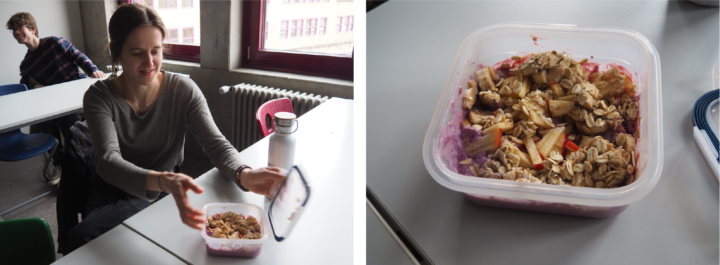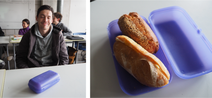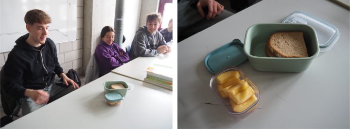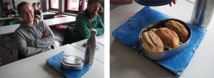 多くの学生が弁当を持参しているんですね。でもさすがに木製はないようでした。パンが多かったですが、グラノーラやフルーツを持参している学生もいました。日本ではご飯やおかずを入れるので、構造、加工方法、接着剤、塗料など、考えることの多い課題であることを説明しました。