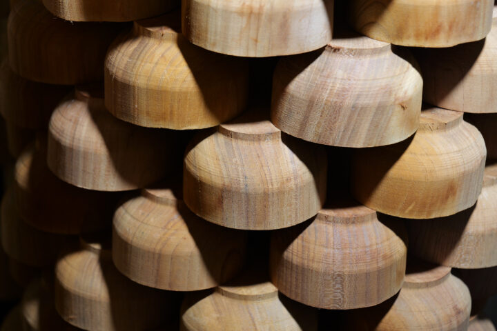 日本の伝統工芸である山中漆器は、分業制で多くの職人の手を経てつくられます。匠頭漆工さんでは、粗挽きされた木地を乾燥し、仕上げ挽きで器を形作る工程、塗装を担っています。