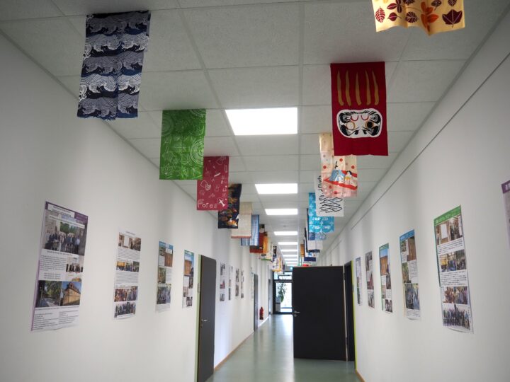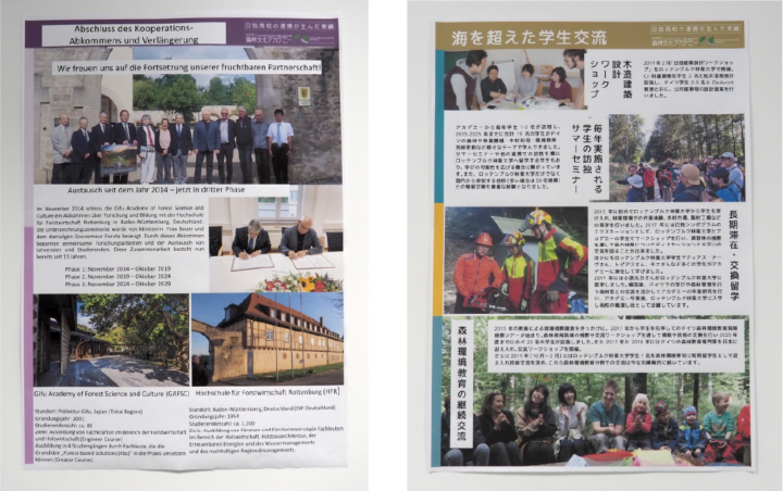 私が訪問した時、学内の廊下にはHFRと森林文化アカデミーとの交流について紹介する企画展示が行われていました。日本語とドイツ語のポスターが多数貼られ、天井には手ぬぐいの装飾も。林業の教授で国際交流室のディレクターも務めるセバスチャン・ハイン教授が担当してくださったとのこと。HFRは世界の40以上の大学と連携しているそうですが、森林文化アカデミーとの関係を大切にしてくれていることを感じます。