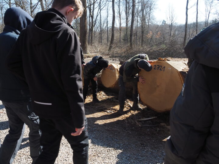 その後は林縁の大きなナラの丸太が置いてある場所(ここで売買が行われるのだそうです)へ移動して、丸太を使った授業が始まりました。