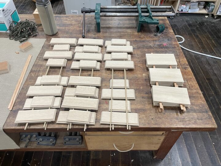 本体の製作過程です。材料にできた小さな傷や毛羽立ちを取っています。本体1つに対して5つの部材が必要になるので、10個作れば本体だけで50個の部材が必要になります。