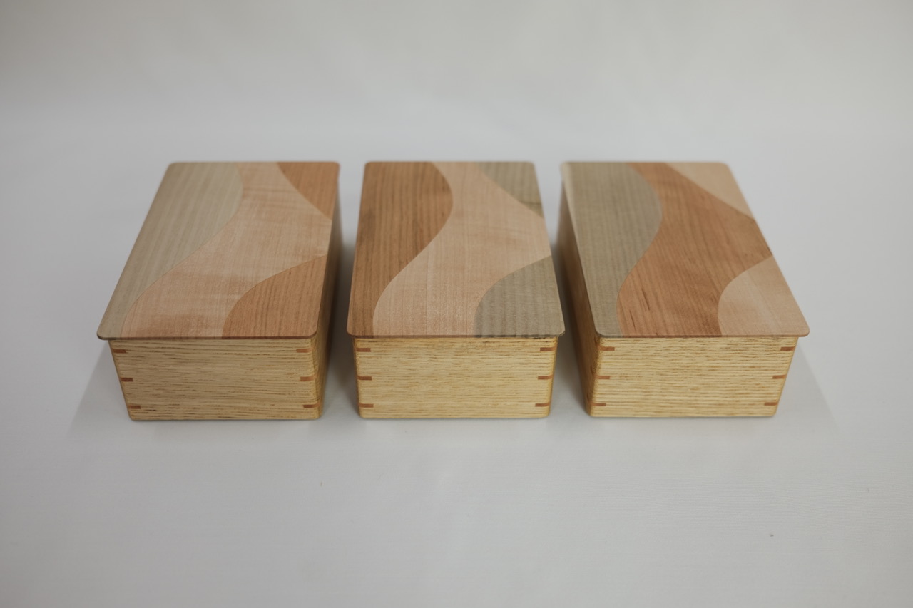 蓋の曲線は山並みをモチーフにしていて、サクラ・トチ・ホオノキの組み合わせは3パターン作りました。樹種による色の違いはもちろんですが、材によっても表情が変わっています。