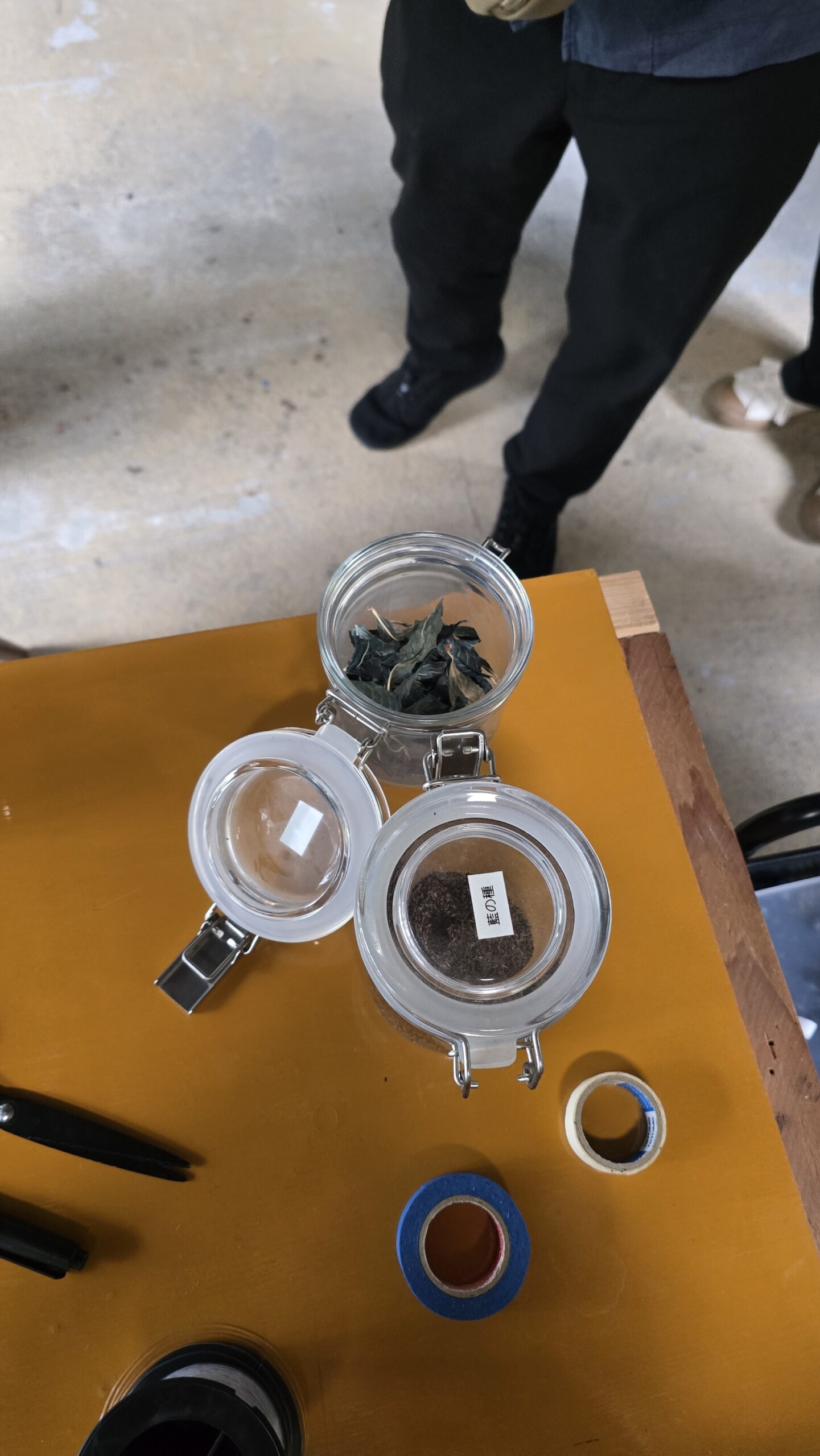 最初に訪ねたのは、嶋田拓真さんと三浦優佑さんの藍染工房「Slow Fabric」です。「藍」とは、ある種の植物に含まれる成分が変化してできる藍色の染料のこと。畑の準備から藍の種取りまで、一年を通して行う作業だそうです。夏から秋にかけて葉を刈り取り、乾燥させて粉にしたり、「すくも」と呼ばれる染料を作ったりします。