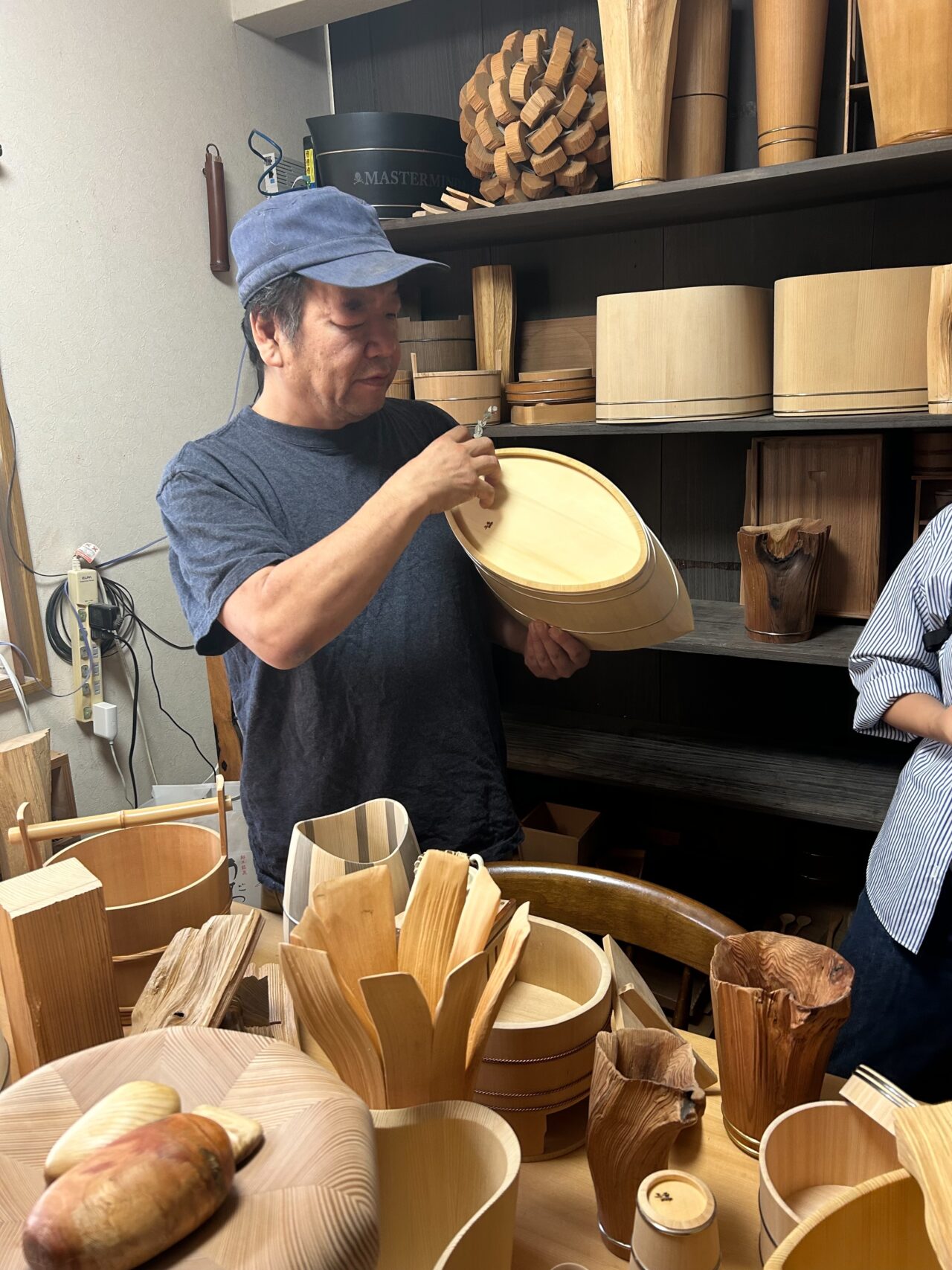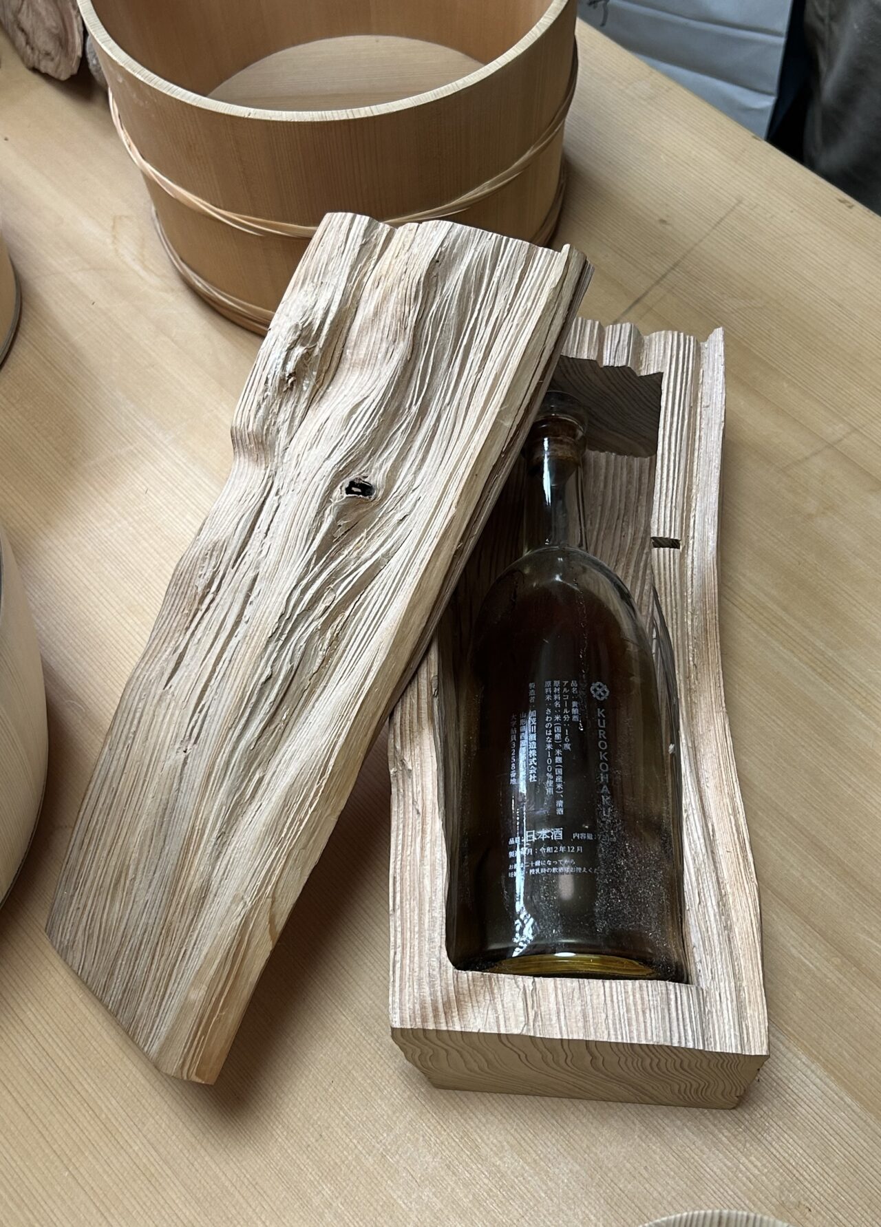 実際に製作中の製品を見ながら説明していただきました。木桶やおひつは、昔はどの家庭にもある一般的なものでしたが、時代の変化とともに桶のあり方も変わり始めました。そのきっかけとなったのが、シャンパンメーカーとのコラボで製作したシャンパンクーラーです。伝統工芸とデザインを合わせた新しいスタイルを確立したそうです。