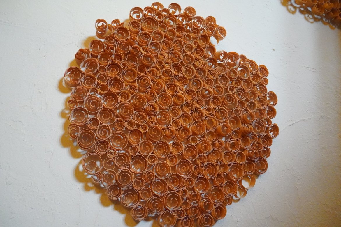 説明の中で特に重要視されていたのは、「いかに材料を無駄にしないか」ということでした。年輪が曲がっていたり節があったりするものは、桶の材として使用できず廃棄になっていたそうですが、それらを割って組み合わせ、中をくり抜くことでワインなどの瓶ケースとして生まれ変わらせていました。桶のくり抜いた部分も計算して別の作品に利用し、鉋屑も無駄にせずアート作品として飾られており、材に対する強い信念を感じました。