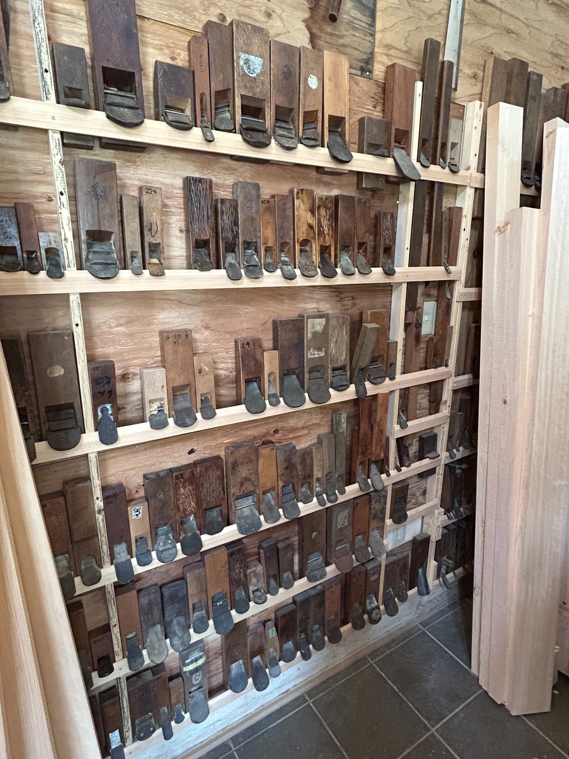 まず、入口から最初に目に入ったのは300本以上の鉋でした。桶の外側の丸みがそれぞれ異なるため、様々な曲面に対応できるように、とても細長い棒鉋などもありました。