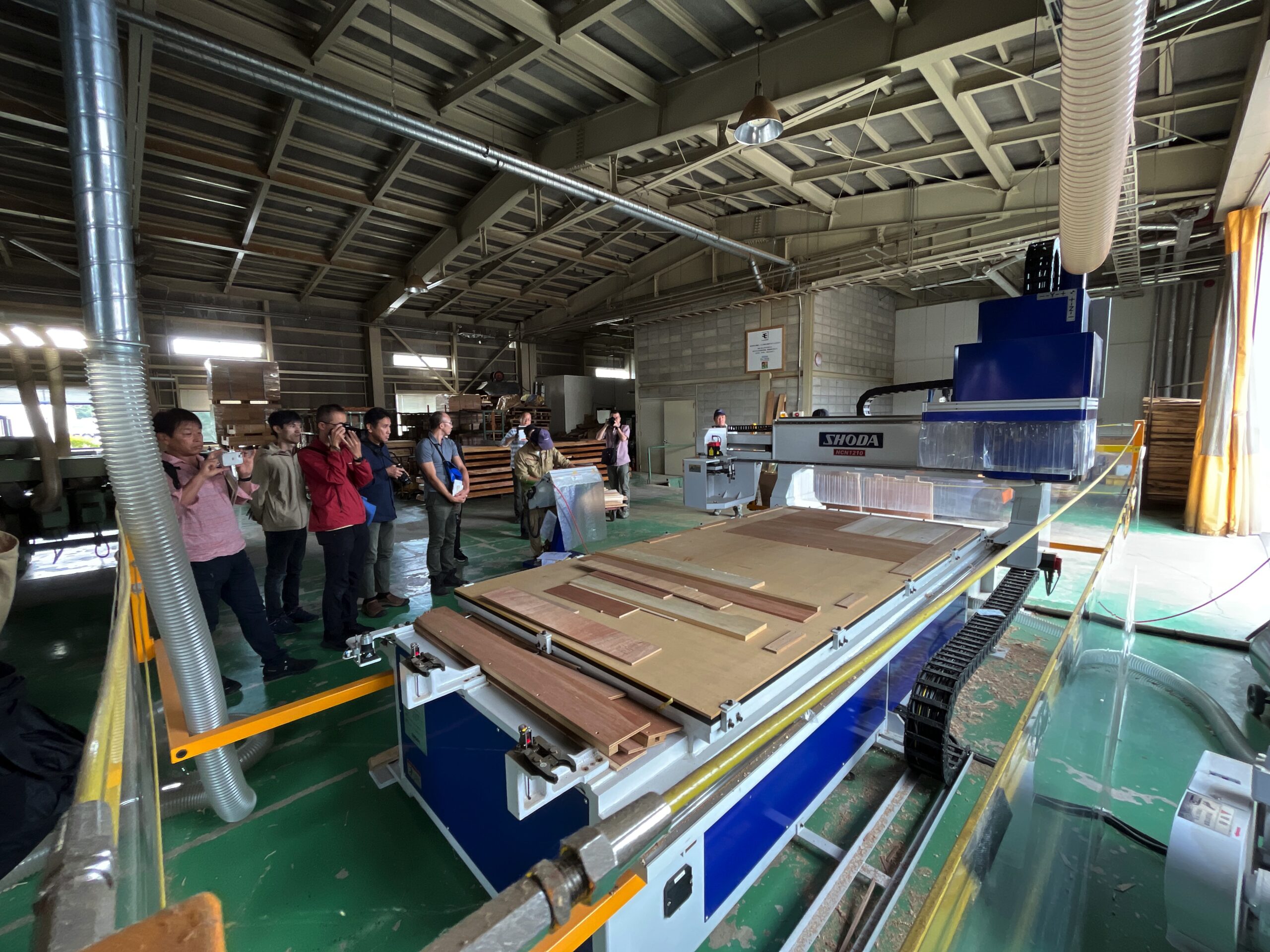 最後に見せていただいたのは、昨年導入されたばかりのCNC加工機です。アカデミーの工房には収まりきらないほどの大型の機械で驚きました。大型だからこそ、難しいプログラミングや複雑な加工が実現できるそうです。このCNC加工機を担当されているのは、アカデミーの8期生である中野陽平さんです。機械は導入したばかりで、実践してみないと分からないことも多々あり、本格的な稼働に向けて研究を重ねておられます。現段階ではフローリング材や壁材の模様加工を検討しており、手彫りしたような加工を機械に指示するプログラムを作成されています。「伝統的な模様ほど、手加工感を出せるようにしたい」と中野さんは伝えてくれました。機械はあくまでも手段の一つであり、それを最大限に活かすためには、自分自身の知識と技術の向上が必要不可欠だと改めて感じました。