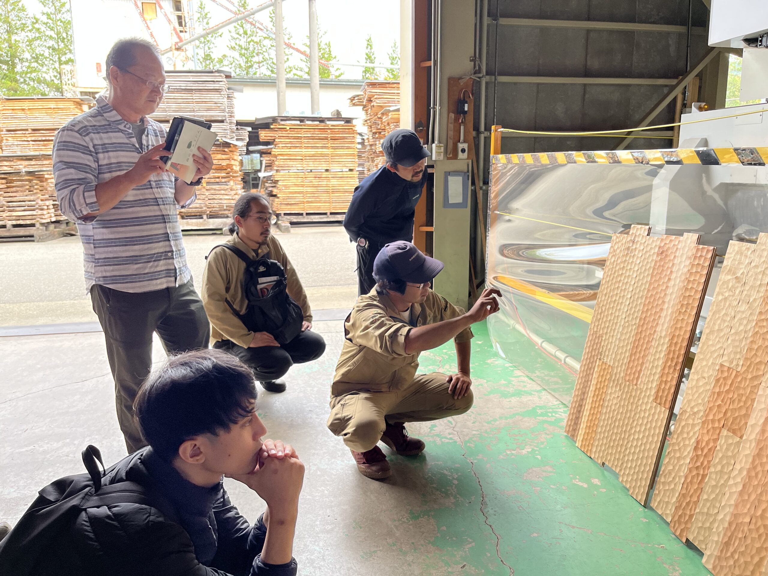 次に、乾燥を終えたフローリング用材を見せていただきました。高く積みあげられていた用材は、厚みは一緒で幅が違う「乱尺幅」でした。これはカネモクが提案している「森のじゅうたん」で利用されるものです。これは、広葉樹の小径木を有効活用するためにおこなわれている取り組みで、幅が異なるだけで基準は満たしているので、フローリング用材として活用できます。ここでもカネモクの乾燥技術が活かされており、加工後も木材が動くことはほとんどないそうです。限られた資源をどう活用して利益を出すかという点は、木工に携わるアカデミーの学生も常に意識すべき点だと思いました。
