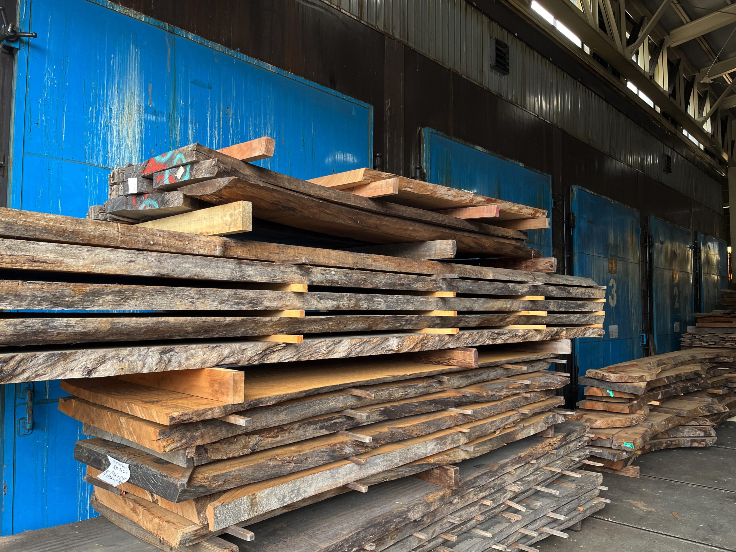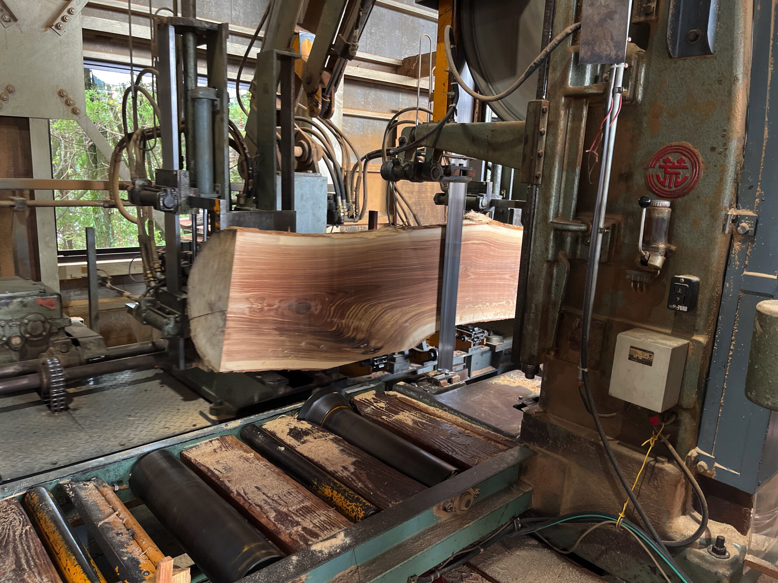 1954年に、クリ材をメインとした鉄道枕木を製造する工場として創業され、現在では広葉樹を専門とした製材所として稼働しています。原木の仕入れ、製材、自然乾燥、人工乾燥、木取りをすべて工場内でおこない、企業や個人工房、木に興味のある一般の方など、買い手に制限なく販売をしています。飛騨市、高山市にはナラ、トチ、クリ、ホオノキなど、広葉樹の種類が豊富にありますが、大径木は少なくなっており、小径木はパルプ用材や木材チップなどの燃料として利用されています。用材の幅を広げるために、曲がった木材も積極的に仕入れるなど、広葉樹という資源の活用方法を常に模索されており、木工専攻の学生として見習うべき大切な考え方だと思いました。