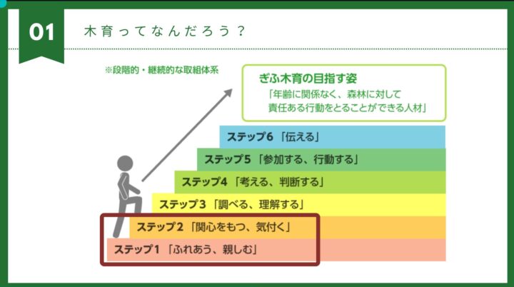 <木育ライト層>向けとするにあたって、何を伝えればいいのか?という事を考えた時には、「そもそも木育という言葉は浸透しているのだろうか?」と感じたことから、講座の冒頭には木育という言葉の始まりと、ぎふ木育についてさわりだけ、そして今回使った材料に関して5分程度にまとめたスライドを使って説明をさせていただきました。